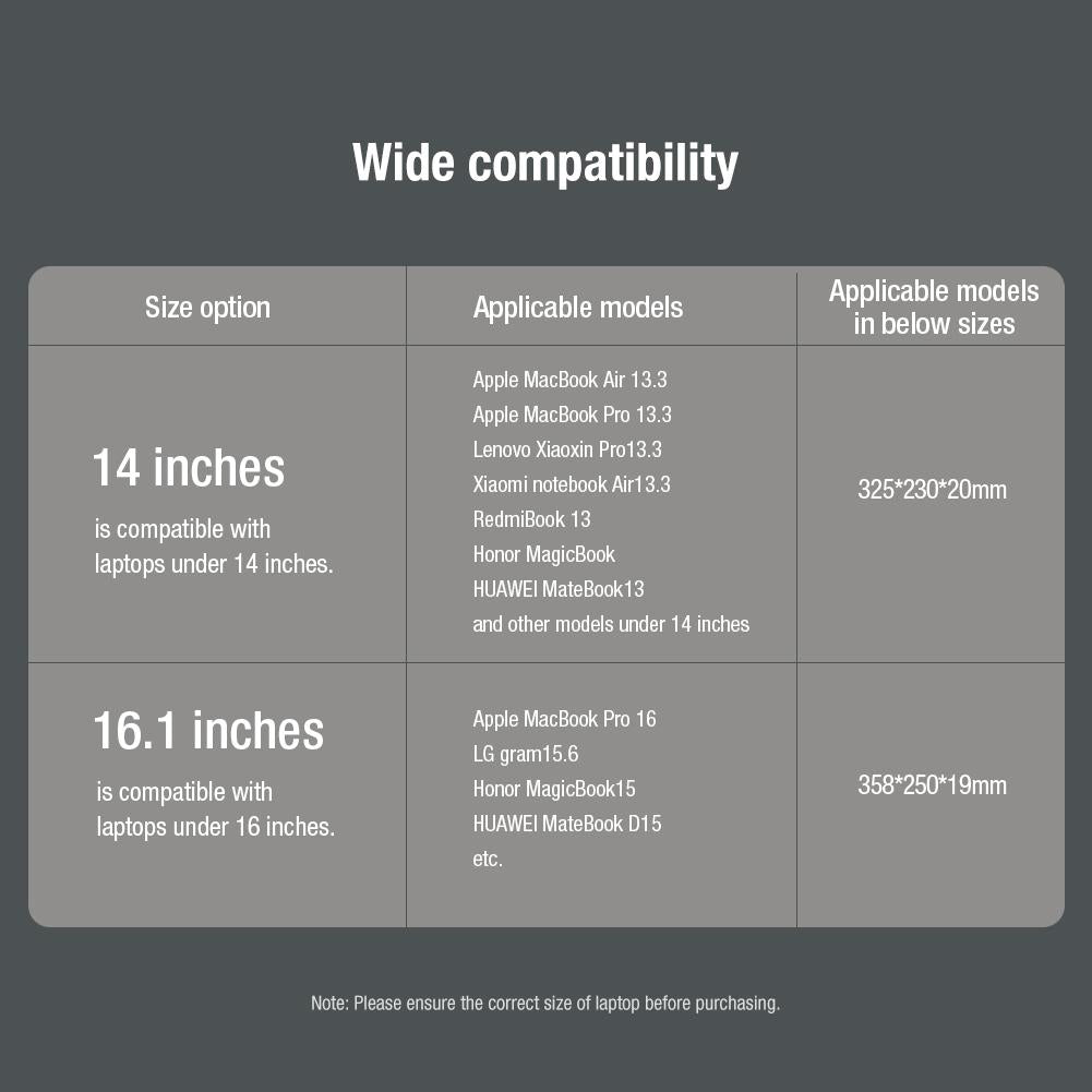 • Size for 14 inches: 365x260x27mm; for 16 inches: 390x290x30mm