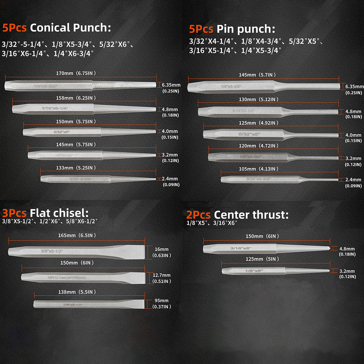- Includes taper punches, pin punches, cold chisels, center punches, and a gauge for diverse applications