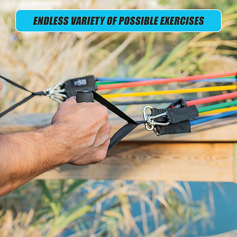 - Includes multiple resistance bands with different resistance levels and types, such as O-Ring and Figure-8 bands.