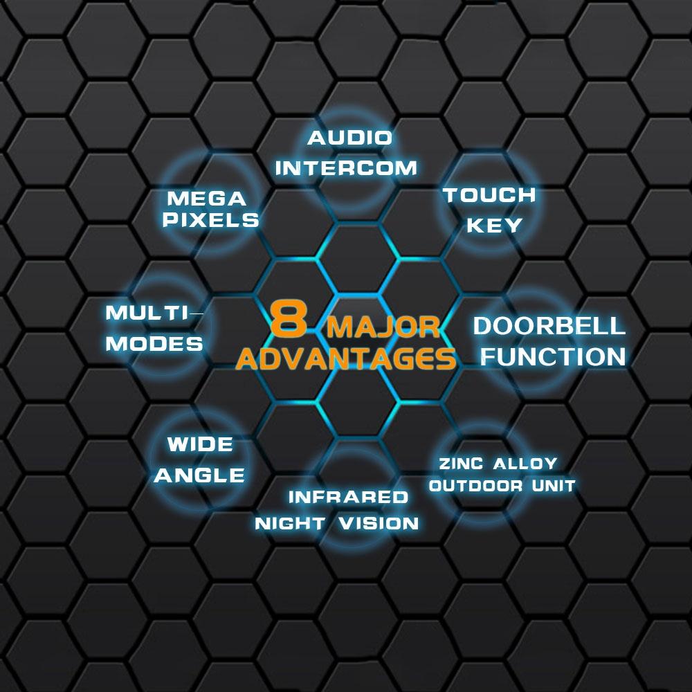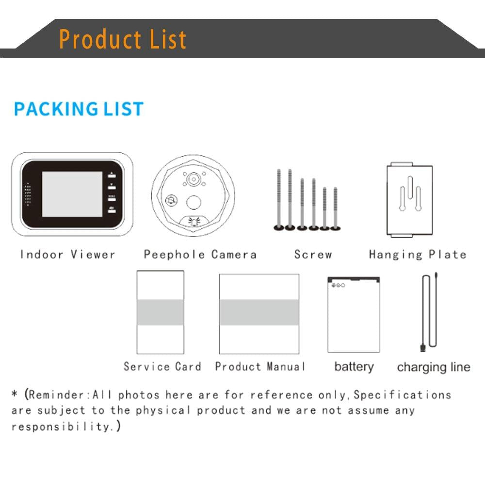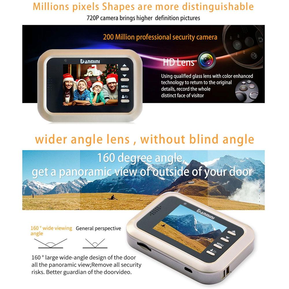 This security camera features a 2.4-inch color screen, a wide 160-degree viewing angle, night vision, and motion detection capabilities. It is powered by a lithium battery and supports various functions including taking pictures, recording videos, and leaving video messages. The device can be connected to USB or mobile power sources and offers multiple ringtone options with adjustable volume. It supports memory cards up to 32GB for storage.