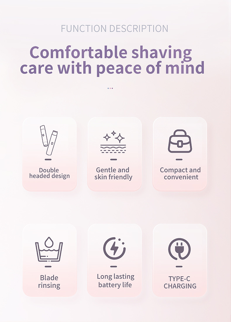 This 2-in-1 electric lady shaver and trimmer offers a gentle and effective solution for full body hair removal. Its versatile design includes a double-headed system for trimming longer hairs and shaving shorter hairs, making it suitable for sensitive areas and all-over use. Compact and stylish, it is portable and rechargeable via USB, ideal for home or travel use, providing a quick and refreshing hair removal experience.