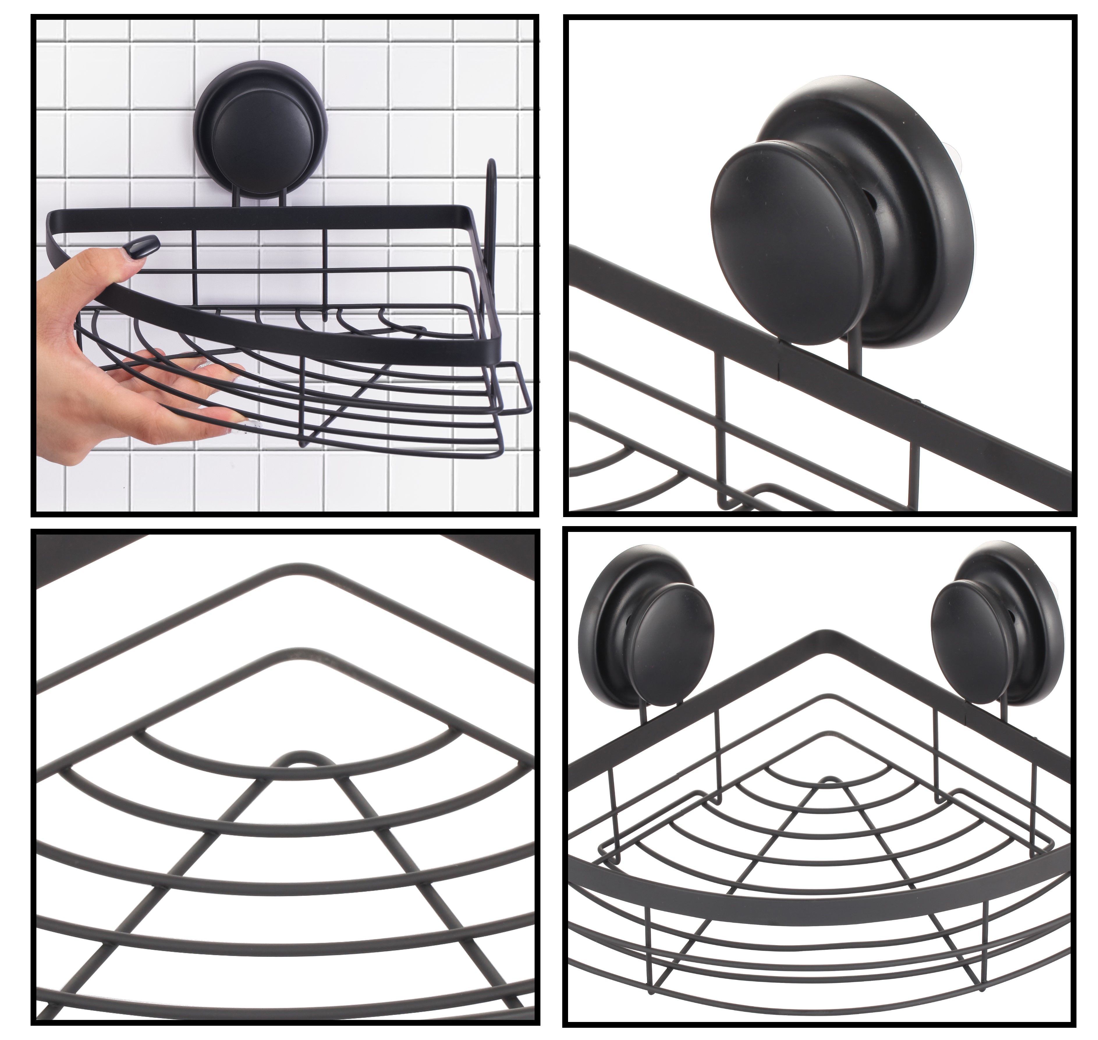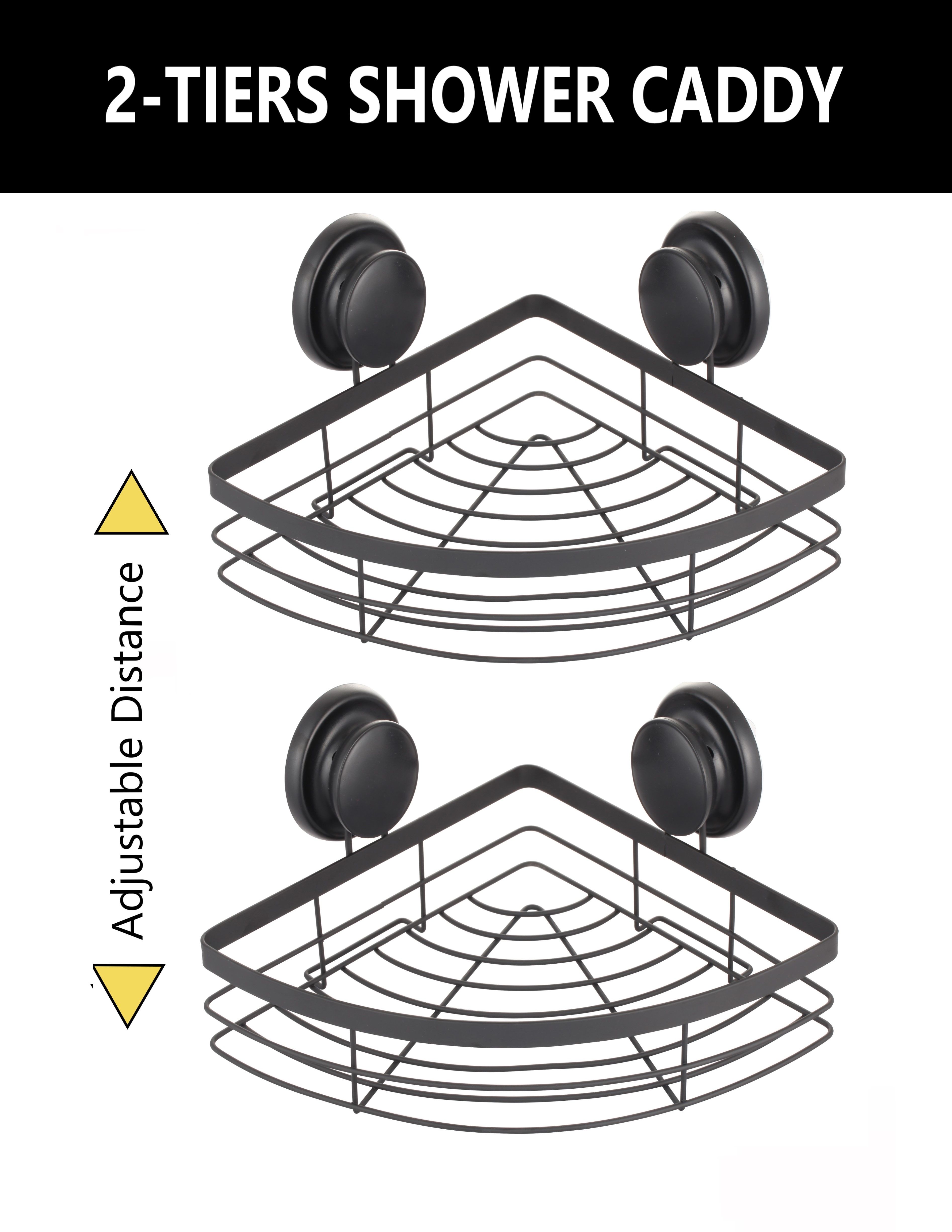 This product features two round corner shower caddy shelves designed to enhance storage in bathrooms and kitchens. The shelves are easy to install without drilling, utilizing premium vacuum suction cups for secure attachment. Made from rustproof and durable materials, they provide a practical solution for organizing shower and bath products.