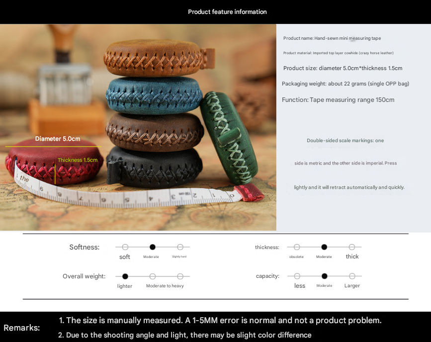 This handmade leather tape measure combines practicality with a stylish appearance. It features a compact, circular design with meticulous hand-stitched detailing around the edges, making it both durable and elegant. The retractable mechanism allows for easy measurement and storage, suitable for various measuring tasks.