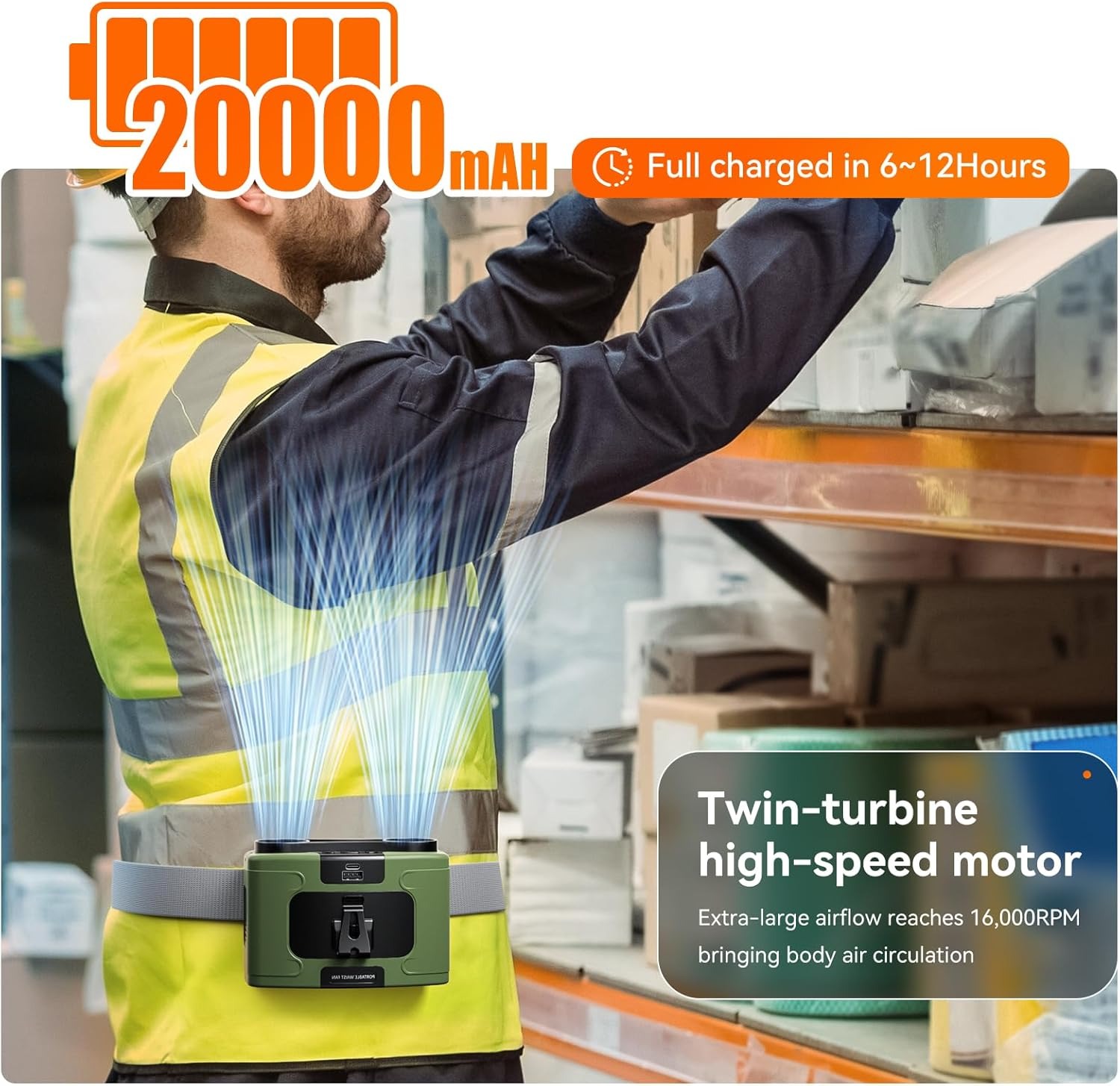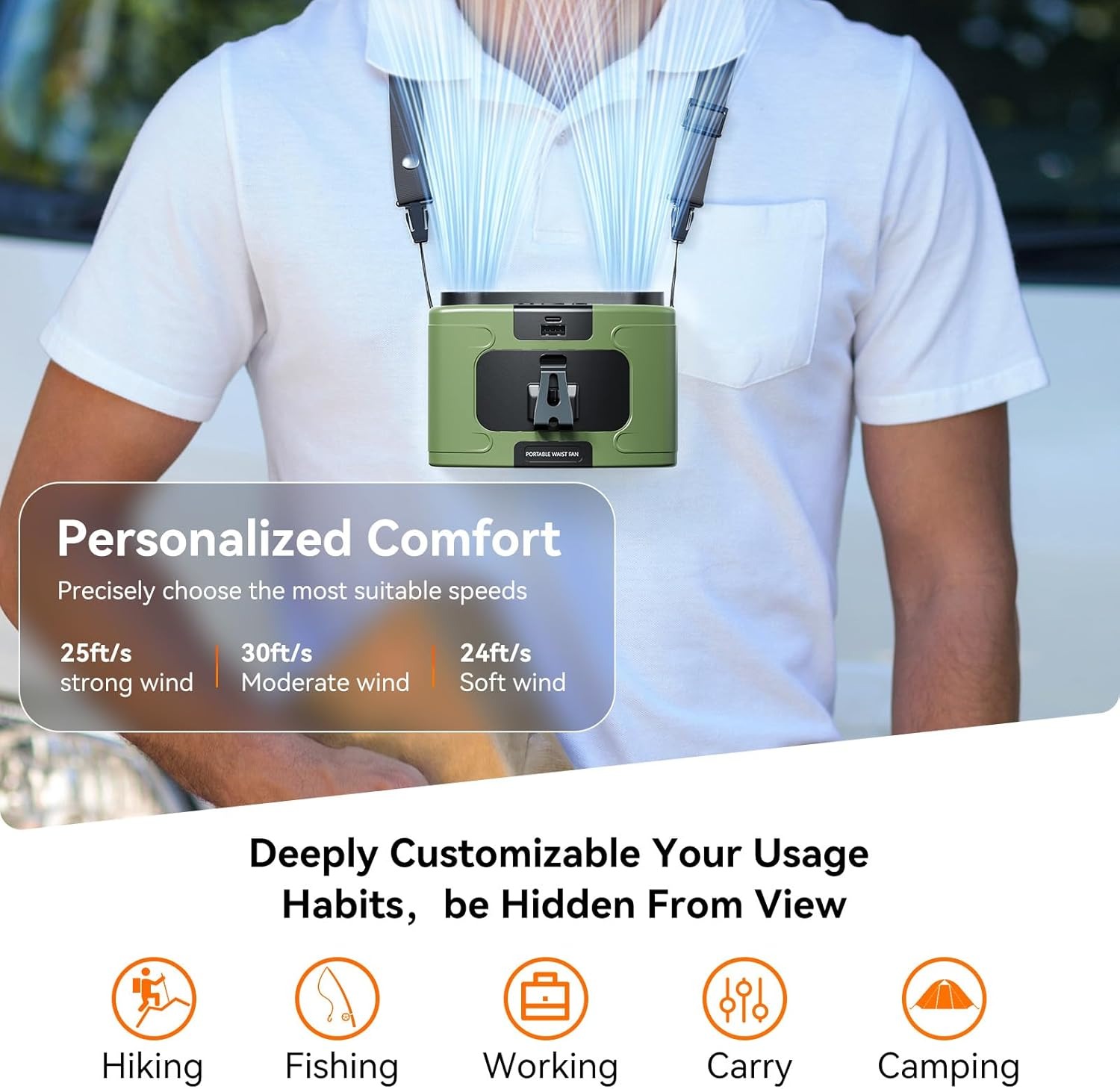 This portable waist fan offers long-lasting cooling with a high-capacity rechargeable battery and a powerful motor. It provides adjustable airflow to keep you comfortable during outdoor activities, work, or sports. The fan features multiple speed settings, emergency power functions, and versatile usage options for convenience and effective heat dissipation.