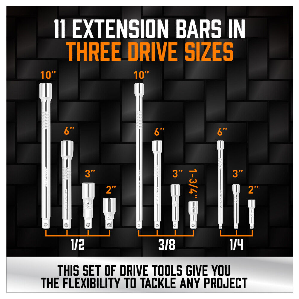 - Extension bars: 4x 1/2″ drive (2″, 3″, 6″, 10″ long), 4x 3/8″ drive (1-3/4″, 3″, 6″, 10″ long), 3x 1/4″ drive (2″, 3″, 6″ long)