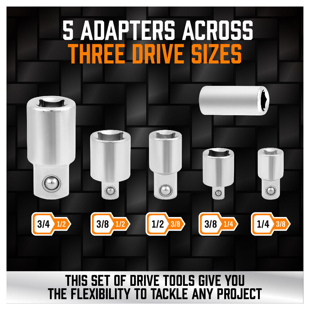 - Reducer adaptors: 1/4″ to 3/8″, 3/8″ to 1/4″, 1/2″ to 3/8″, 3/8″ to 1/2″, 3/4″ to 1/2″