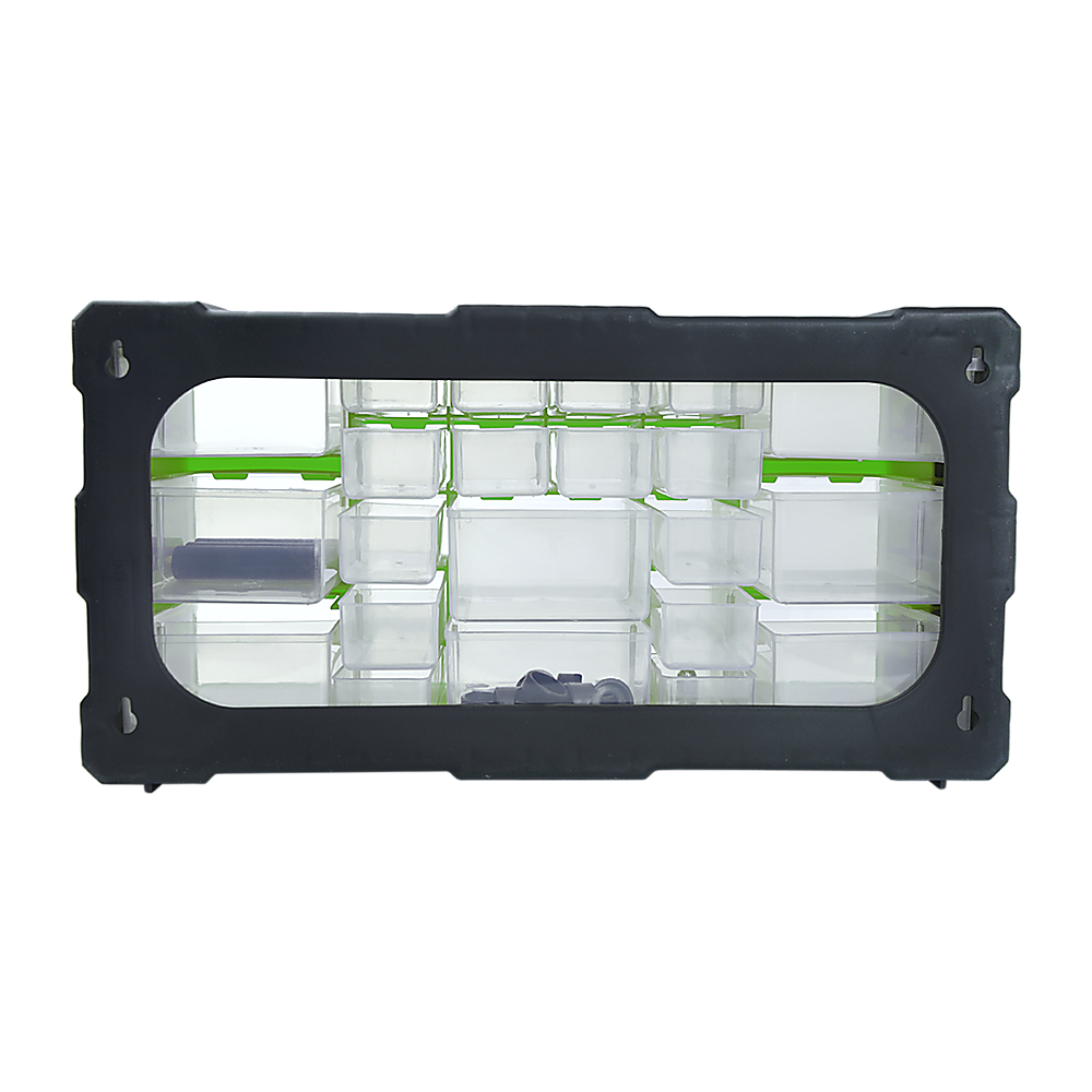 This 22-drawer parts storage cabinet is designed to help you keep your tools, screws, bolts, nuts, and small accessories well-organized. Suitable for use in garages, workshops, or even in vehicles, it features transparent drawers for easy identification of contents and removable spacers to accommodate various sizes of items. The cabinet can be used as a free-standing unit or mounted on a wall, offering versatile storage options.
