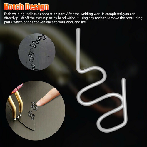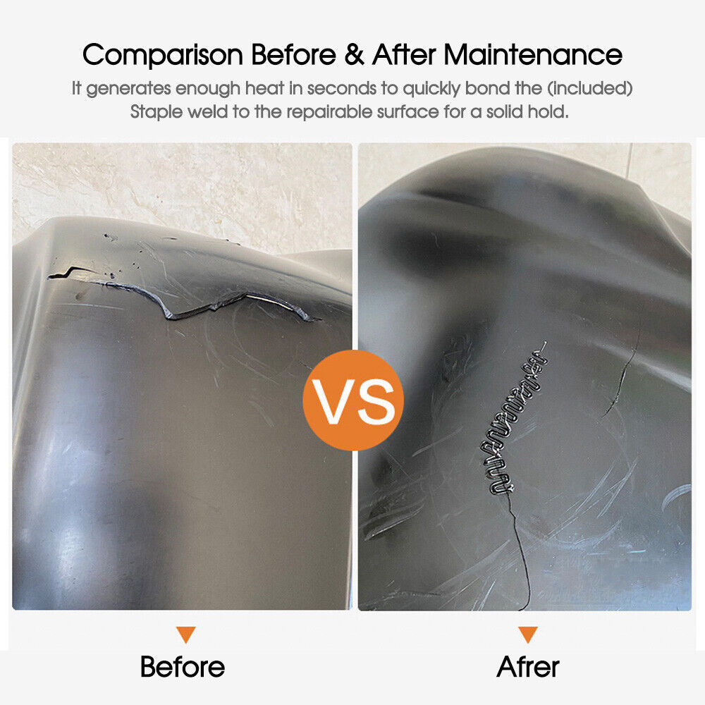 The plastic welder kit is designed for repairing a wide range of plastic products, providing a strong and durable fix. It features stainless steel staples that resist rust, a wavy staple design for enhanced load capacity, and a quick, easy operation that requires no special training. The staples weld seamlessly into plastic surfaces, making it suitable for repairing cracked bumpers, headlights, plastic wings, and more.
