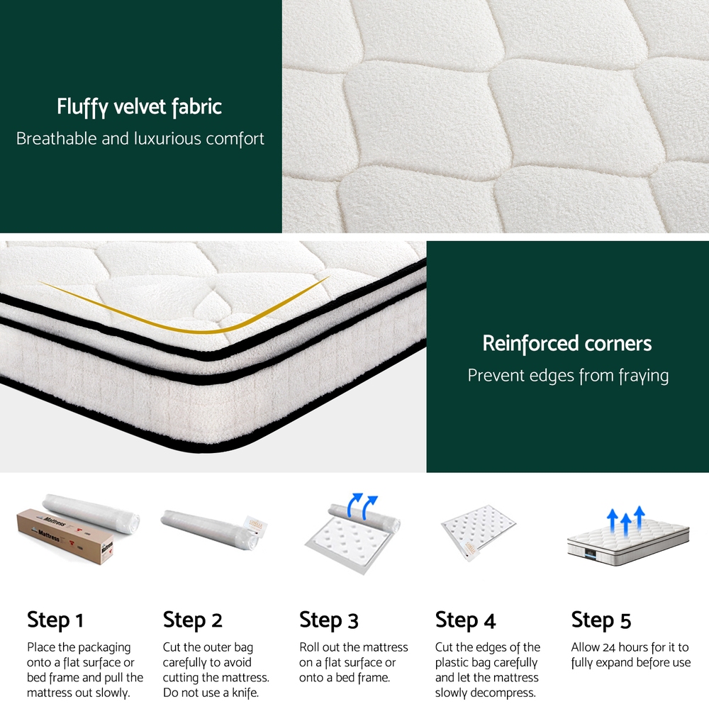 Experience superior sleep comfort with this 22cm thick mattress featuring a Euro Top design for added softness and support. The mattress is constructed with an independent pocket spring system enhanced by 6-turn coils, providing targeted contouring and excellent support. Wrapped in a plush velvet fabric, it offers a hypo-allergenic surface suitable for sensitive sleepers. The high-density foam base ensures stability and durable edge support, making it a reliable choice for restful nights.