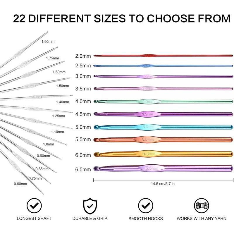 • Complete 22-piece crochet hook kit with sizes ranging from 0.6 mm to 6.5 mm