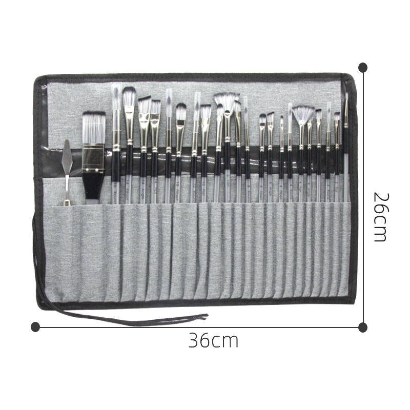 - 1 roll-up canvas brush holder (approximately 36cm x 26cm when open)