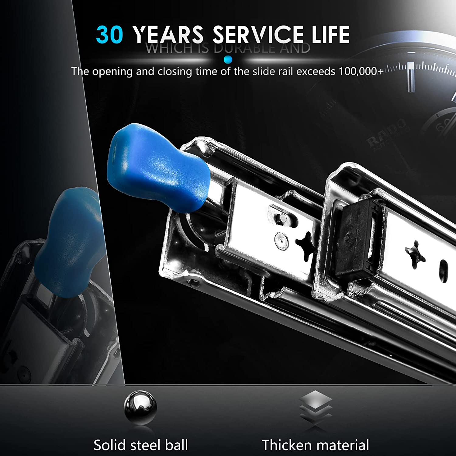 This heavy-duty drawer slide is designed for durability and secure operation. It features a locking mechanism to prevent unintended sliding, ensuring safety and stability during use. The slide has undergone extensive testing, with a lifespan of up to 30 years, and is suitable for various applications requiring reliable drawer movement.