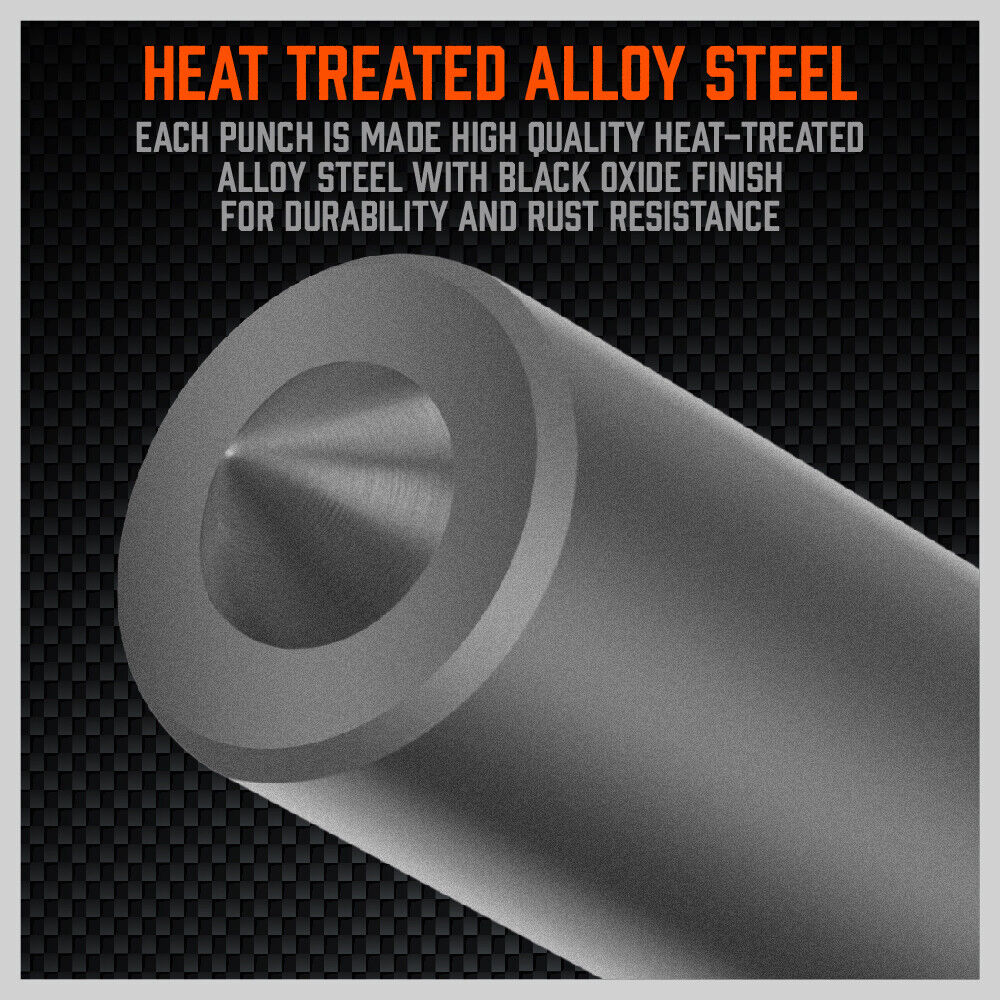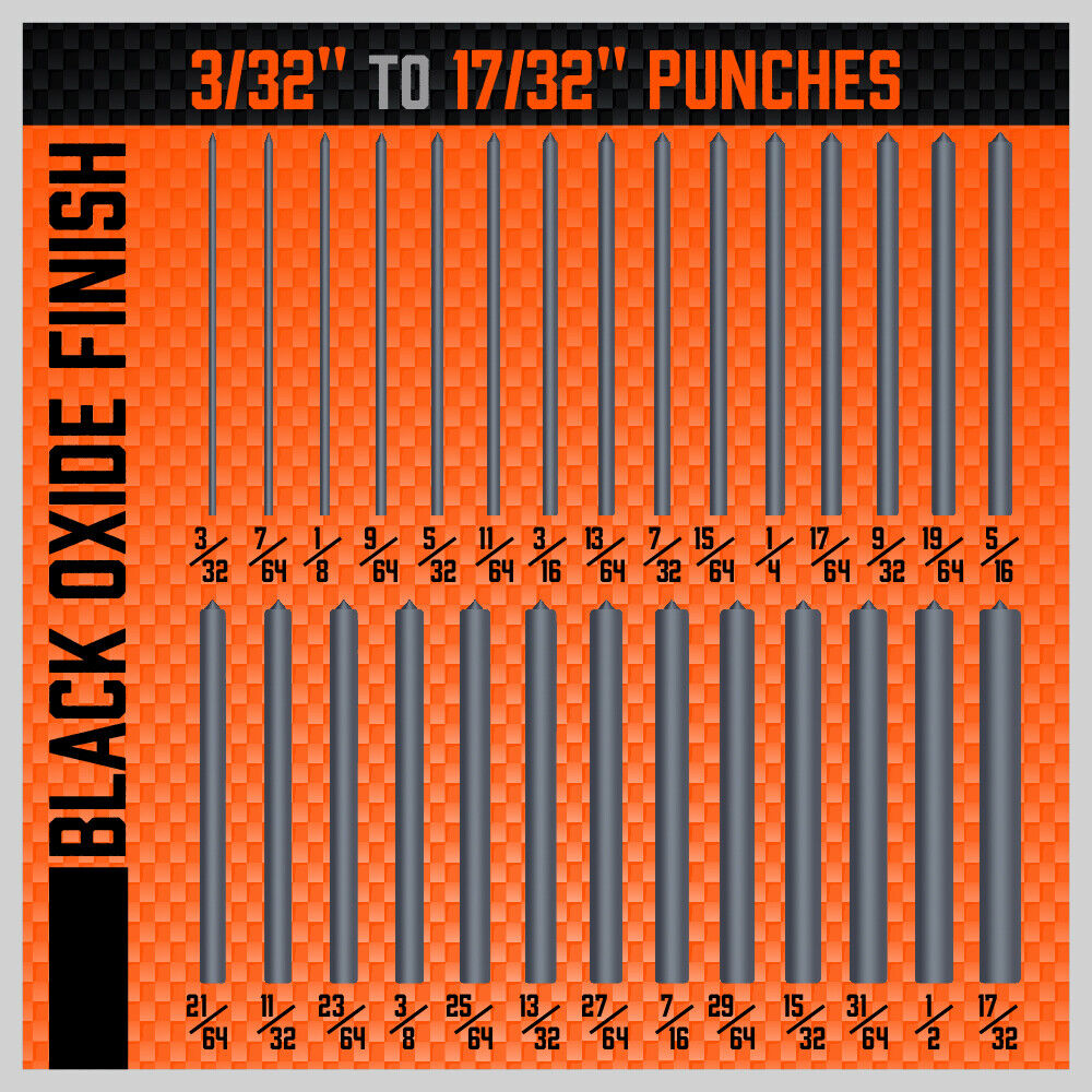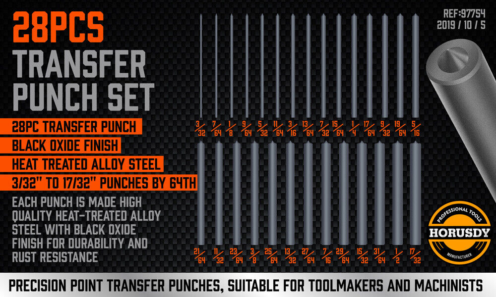 - 28 transfer punches in various sizes from 3/32″ to 17/32″