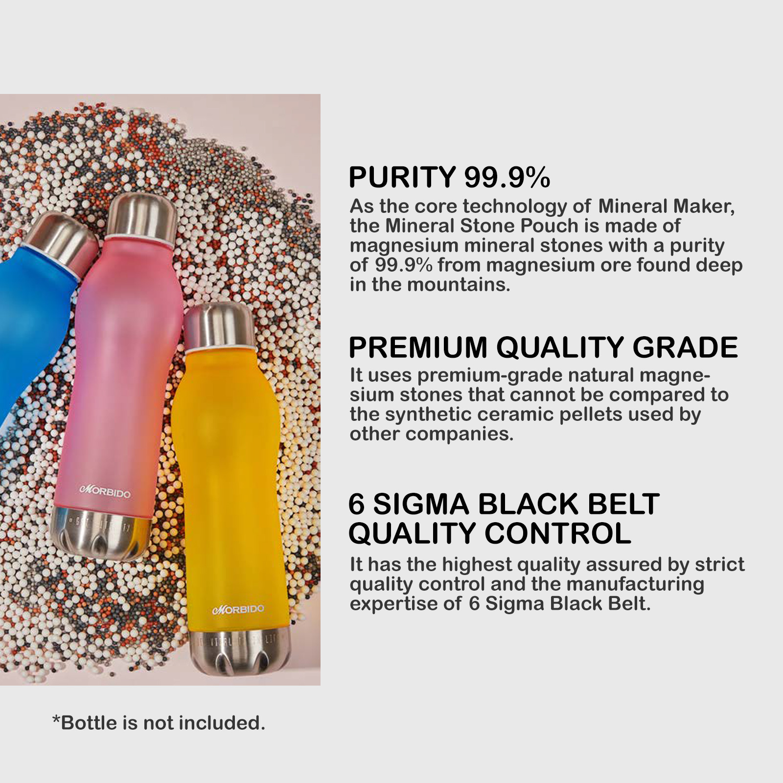 This product includes replacement mineral stone pouches and filter pads designed to enhance your drinking water with beneficial minerals. It helps to increase magnesium content, improve taste, and promote hydration, supporting a healthy lifestyle.