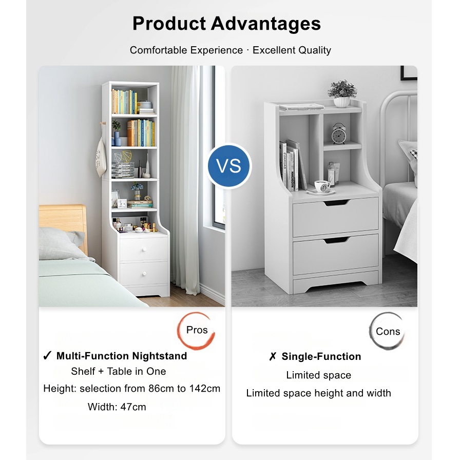 2x Bedside table set with drawers, slim tall cabinet, multifunctional design