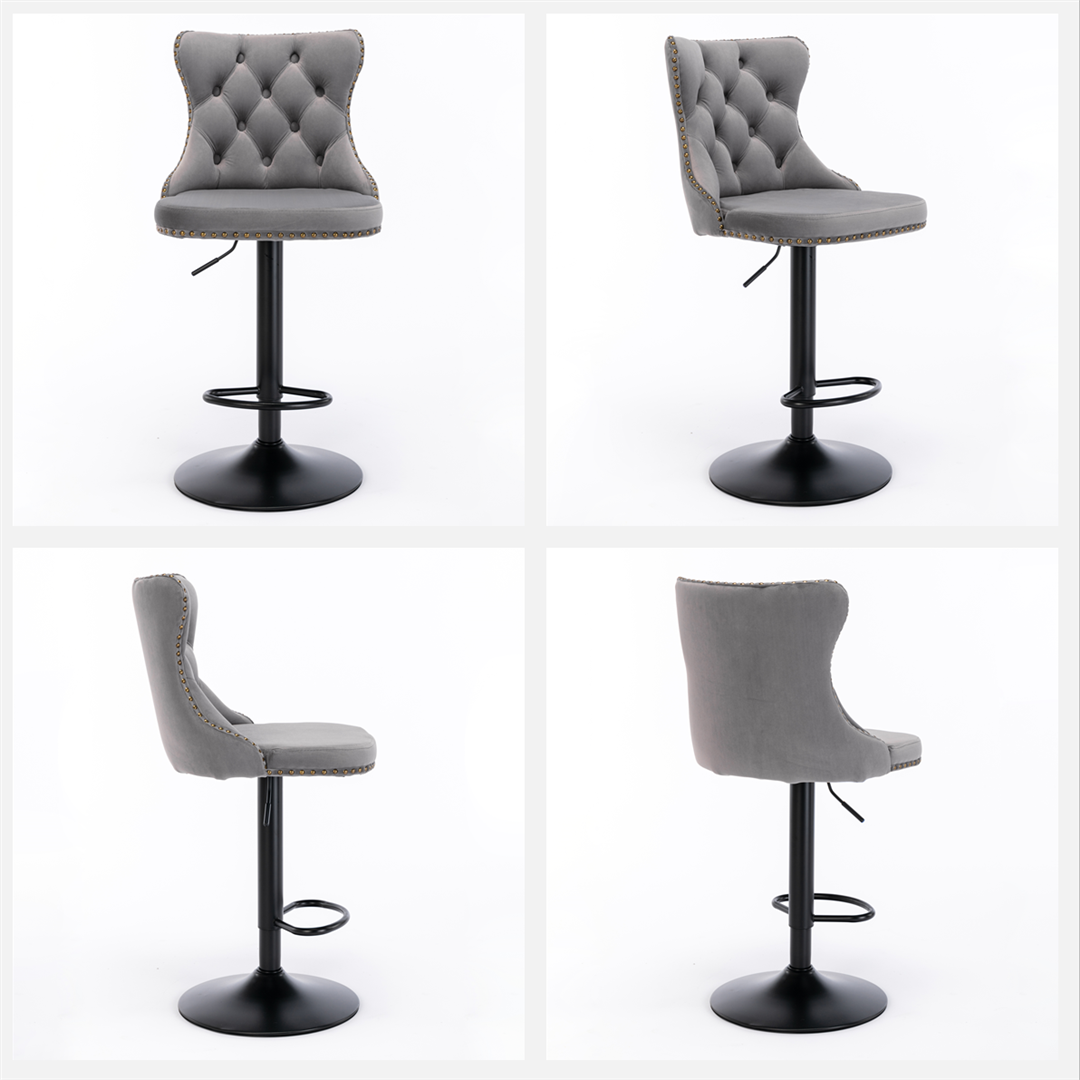 This adjustable swivel bar stool features a stylish velvet upholstery with nailhead accents, combining modern elegance with functional design. It offers adjustable height and a comfortable footrest, making it suitable for various settings and occasions.