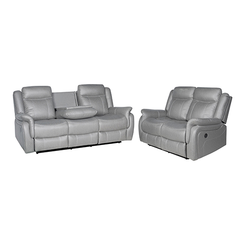 This 3-2 seater recliner sofa features a sturdy construction with a metal mechanism and is upholstered in high-quality grey fabric. It offers a luxurious and comfortable seating experience with plush padding and soft armrests, making it suitable for relaxing and lounging. The sofa is designed with modern amenities and multi-functional features to enhance user comfort and convenience.