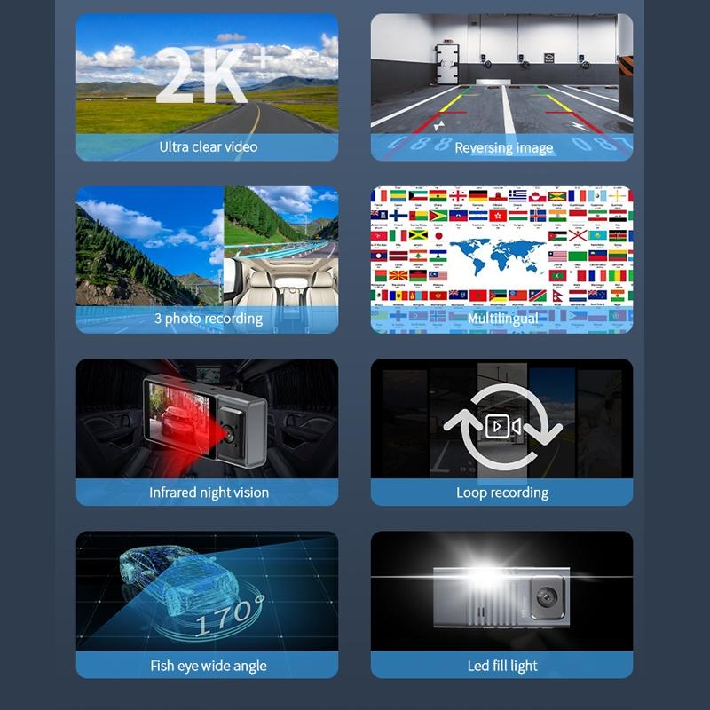 This 3-in-1 car dash cam features a comprehensive three-channel system with multiple cameras to provide extensive coverage of the front, in-car, and rear views. It supports simultaneous recording from all three cameras, making it ideal for capturing evidence during disputes or accidents. The device is equipped with a high-performance chipset and sensors that deliver real-time video feedback on a 3-inch IPS screen. It also offers night vision and infrared cabin lights to ensure clear visibility and accurate color reproduction in various lighting conditions. Built-in WiFi hotspot allows for quick and easy data transmission within a range of 30 feet.