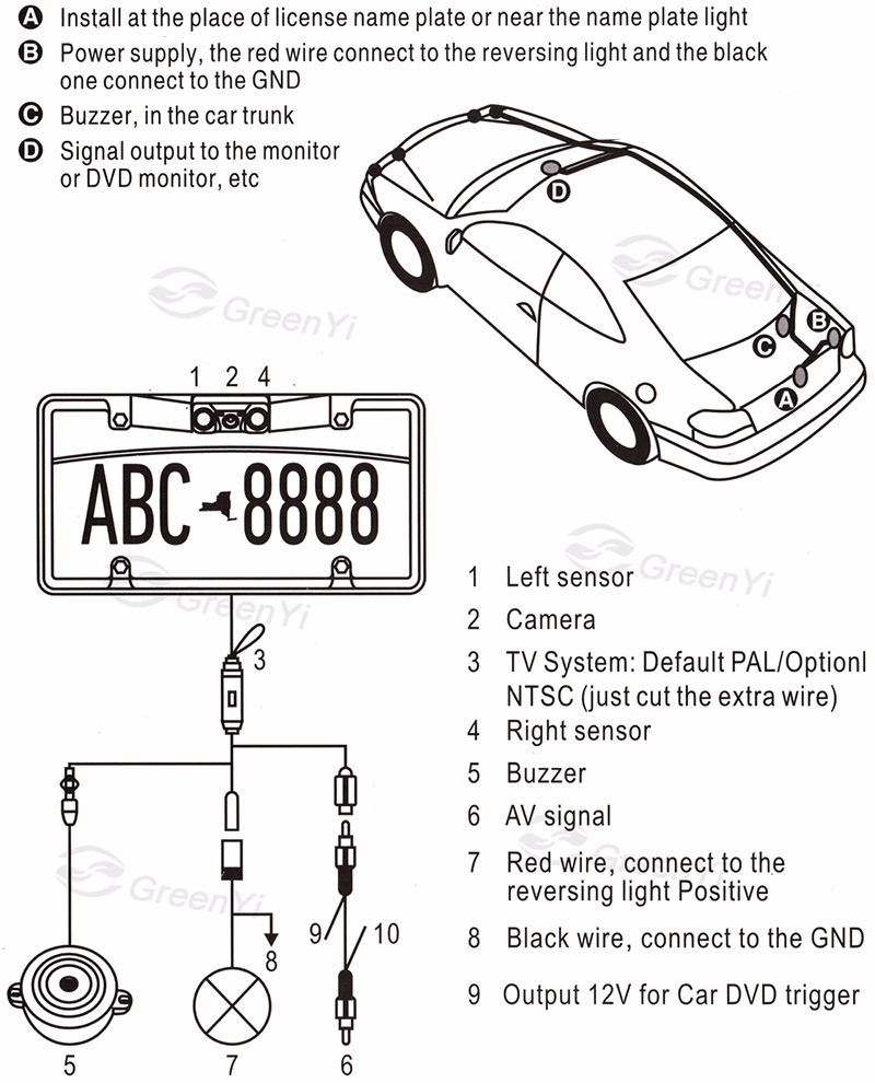 - Power supply: 12V connection to vehicle’s reversing light