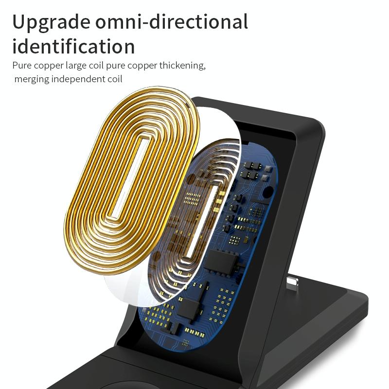 This 3-in-1 foldable wireless charger is designed to simultaneously charge your iPhone, smartwatch, and wireless earbuds. Its versatile design allows for both horizontal and vertical charging, providing convenience and efficiency. The charger features a non-slip silicone pad for stability, a foldable back cover for durability, and a lightweight, compact form suitable for travel. It offers fast charging with multiple safety protections and efficient heat dissipation to ensure low temperature operation.