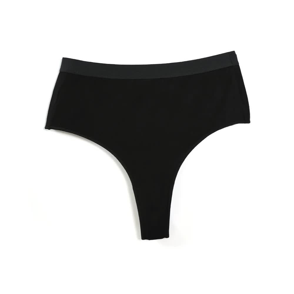 - 3 pieces of high-waisted cotton thong panties in White, Black, and Blue Aster