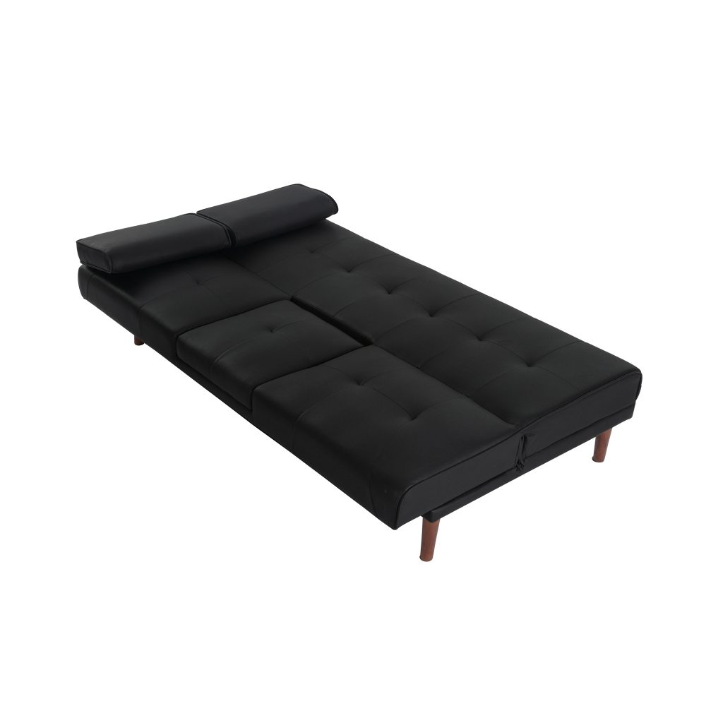 This three seater adjustable sofa bed features a multifunctional design suitable for various living spaces. Crafted with soft, durable tech leather-look fabric, it offers comfort and style. The sofa includes detachable armrests and a hidden folding middle compartment that transforms into a table with two cup holders, providing convenience and versatility for relaxation and guest accommodation.