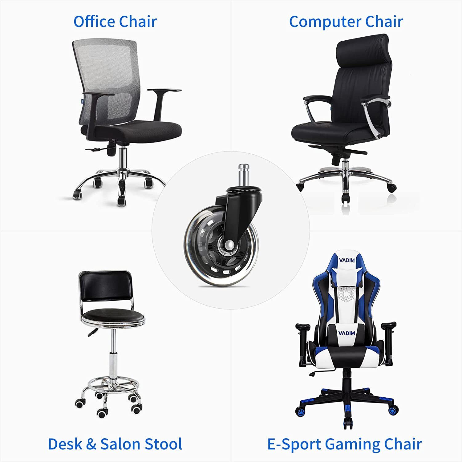 This set includes five swivel rollerblade chair wheels designed for smooth movement on all floor types. The wheels feature a 7/16″ stem for easy installation and are suitable for upgrading office or desk chairs. They are built to support daily use, providing stability, quiet operation, and protection for floors from scratches.