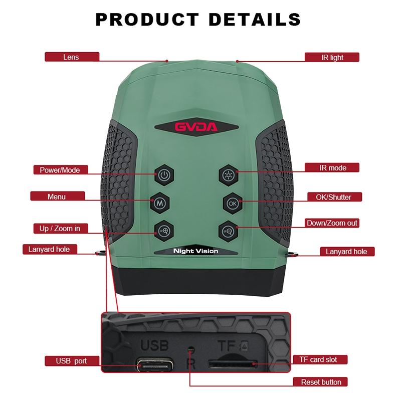 This binoculars feature a 3.0-inch TFT screen with IPS full viewing angle, offering clear and detailed images. It is equipped with multiple operation buttons, TF card storage (card not included), and a Type-C USB interface for versatile connectivity. The device provides adjustable display brightness, digital zoom, and a large aperture lens for enhanced viewing experience. It supports night vision with infrared technology, allowing viewing up to 600 meters in total darkness and from 0.5 meters to infinity under low light conditions. The binoculars are suitable for various environments with a working temperature range of -10 to +50 degrees Celsius. It offers multiple video and photo resolution options, loop recording, and different shooting modes including slow motion and time-lapse. Powered by 8 AA batteries, it also features a standard tripod socket for stable mounting.