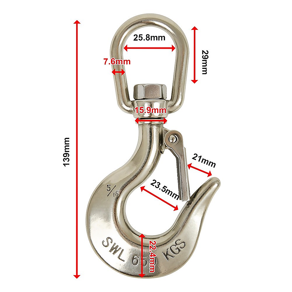 The hook offers smooth operation with a safety lock to secure loads during lifting. Its design includes a clevis top for secure attachment and a 360-degree swivel for flexible movement, allowing for precise positioning in different applications.