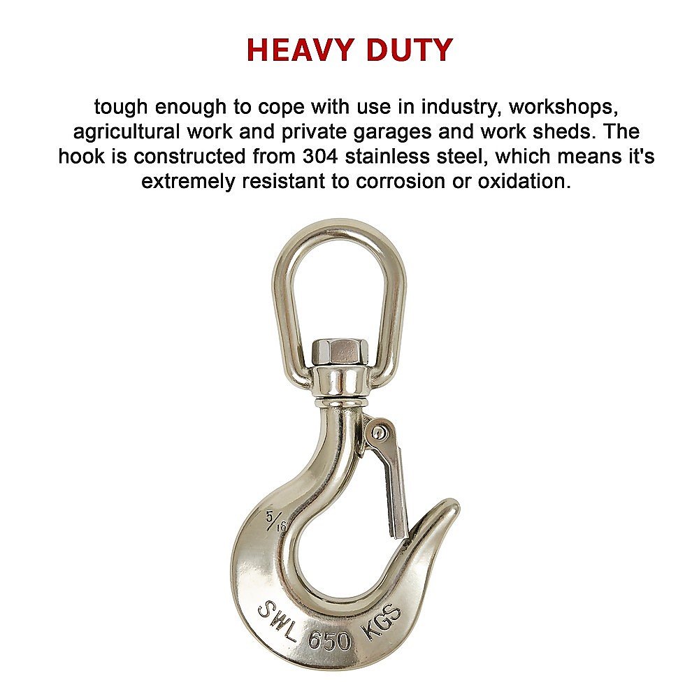 This stainless steel swivel lift clevis chain hook is designed for durability and reliable performance in various environments. It features a robust construction suitable for industrial, workshop, agricultural, and private use, with resistance to corrosion and oxidation, making it ideal for outdoor and moist conditions.