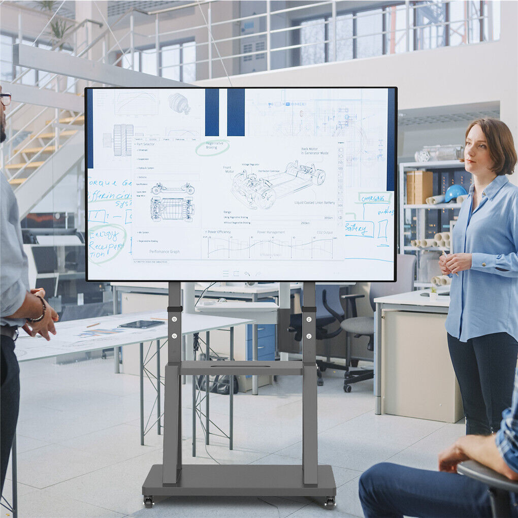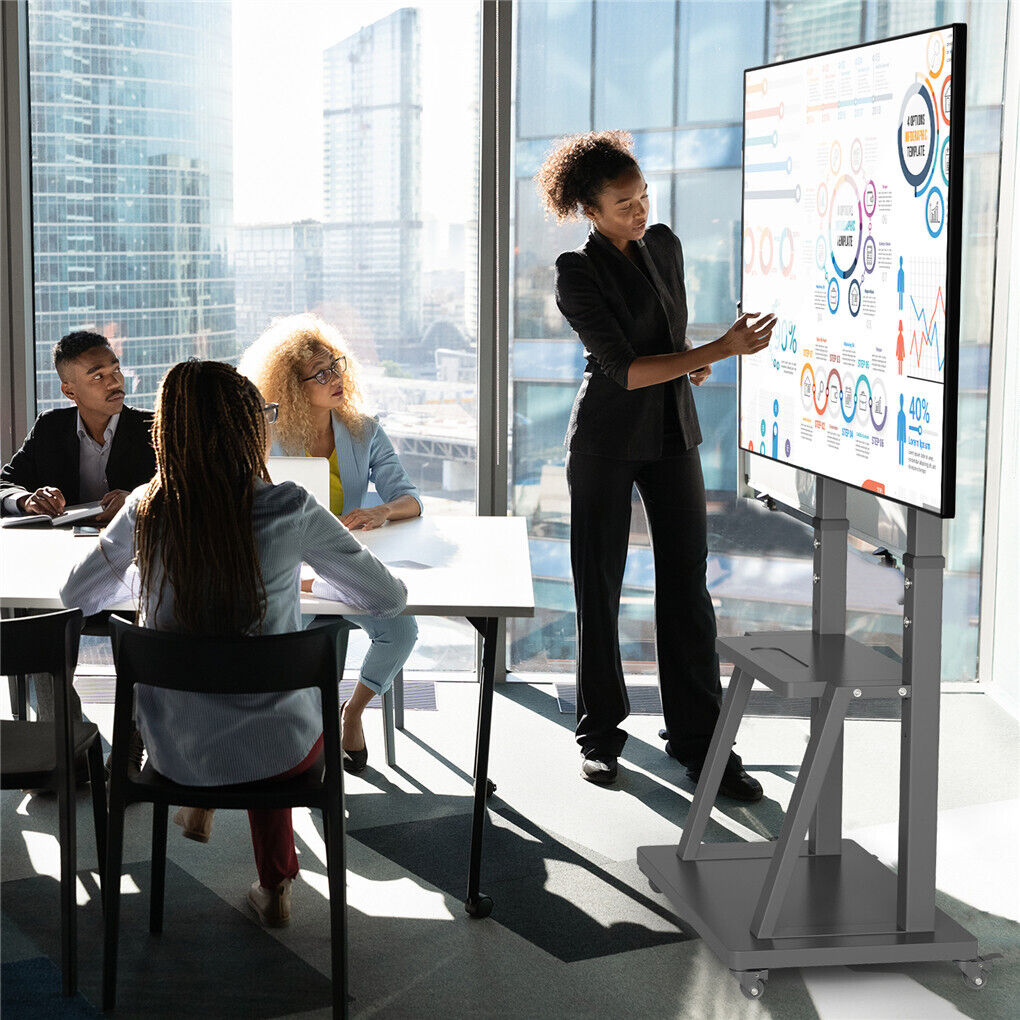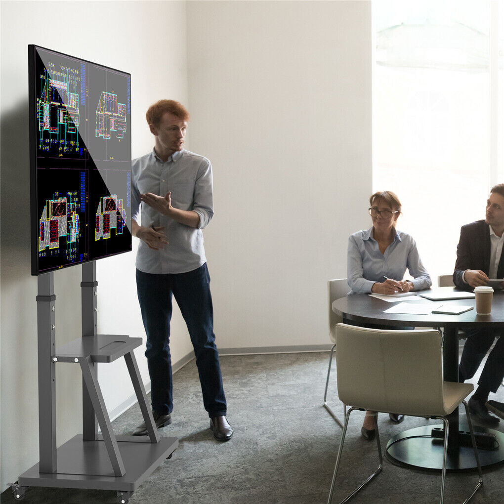 This heavy-duty TV wall mount with shelf and wheels offers versatile compatibility, supporting most LED and LCD TV screens from 32 to 100 inches with a maximum weight capacity of 176 pounds. It features enhanced mobility with lockable caster wheels and provides stability through triangle support reinforcement. The adjustable height allows for customization between 130cm and 160cm, and the dual shelf design offers convenient storage for AV equipment. Constructed from durable heavy-duty iron, it is designed for long-lasting use and easy assembly.