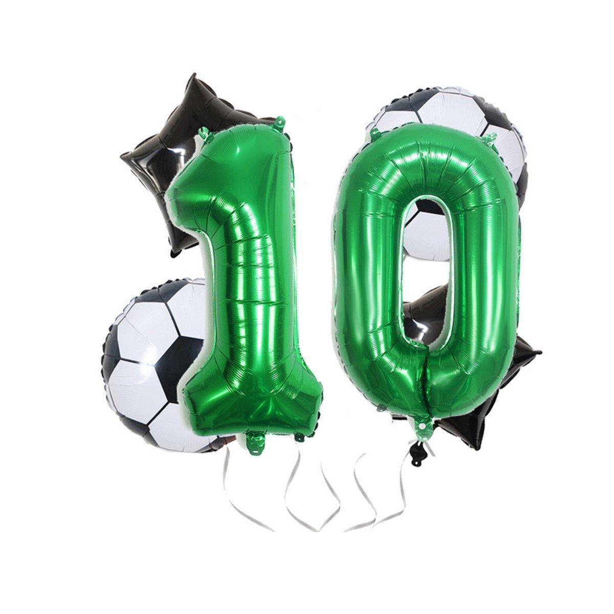 Colors: Green number balloon, black star, and classic soccer design balloons