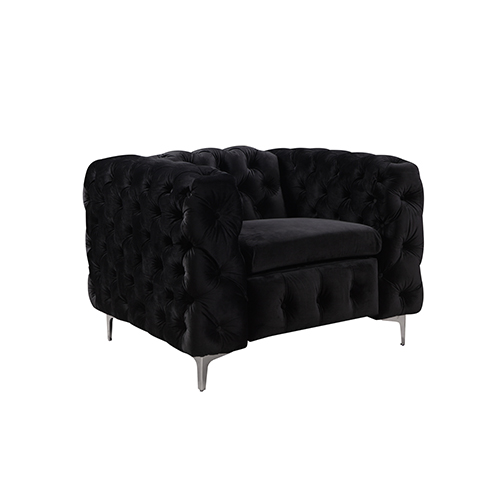 This sofa set features a classic button-tufted design with a sleek black velvet fabric upholstery and sturdy metal legs. It offers versatile seating options with 3, 2, and 1 seater configurations, making it suitable for spacious living rooms. The design combines modern aesthetics with comfort and durability, providing an elegant addition to your home decor.