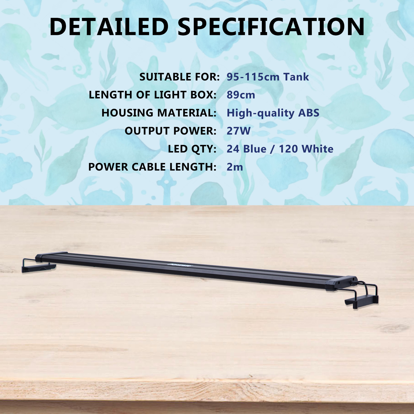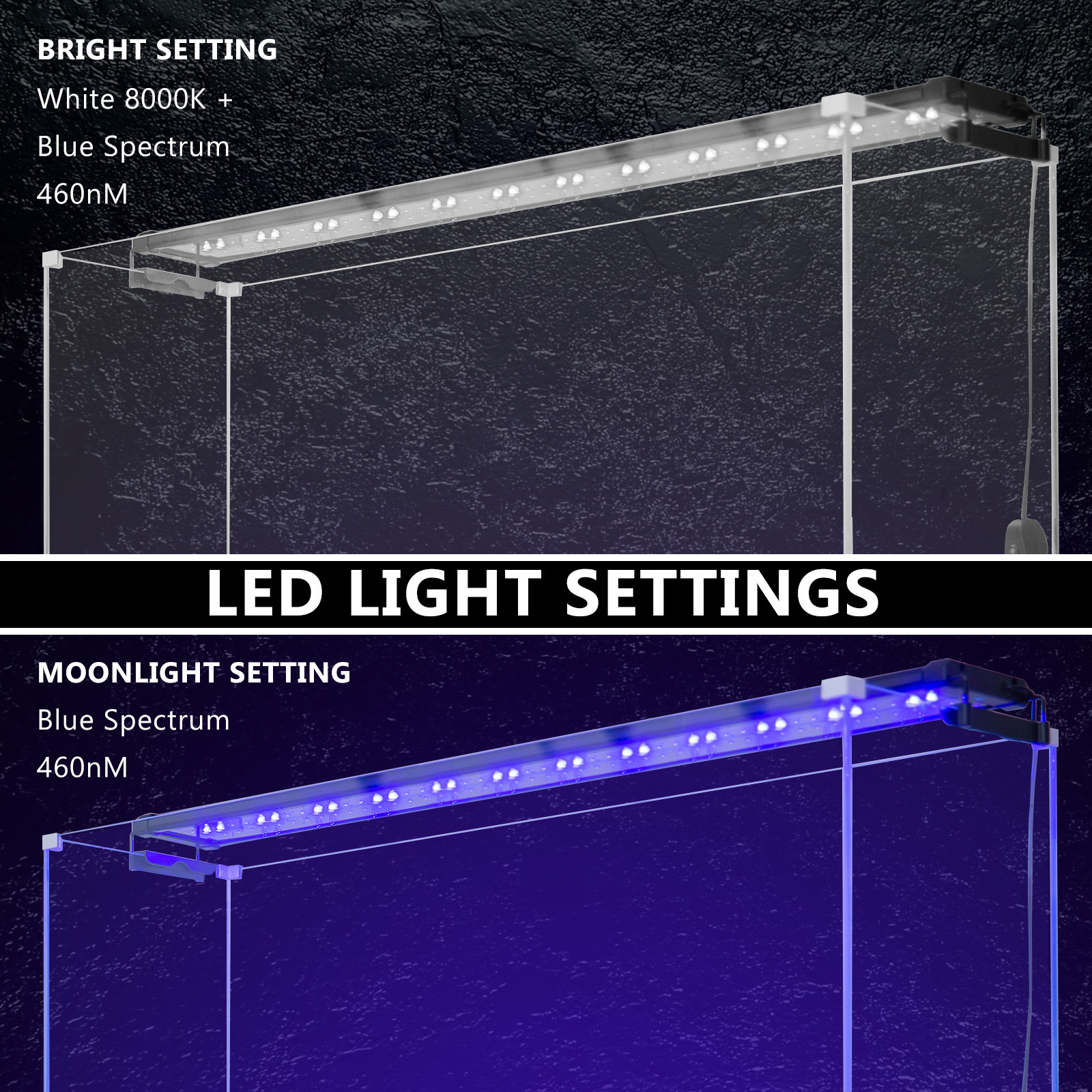 This 33W aquarium LED light is designed to enhance the appearance of your fish tank, providing natural-looking illumination with adjustable settings. It features both white and blue lighting options to simulate natural sunlight and moonlight, promoting a healthy environment for fish and aquatic plants.