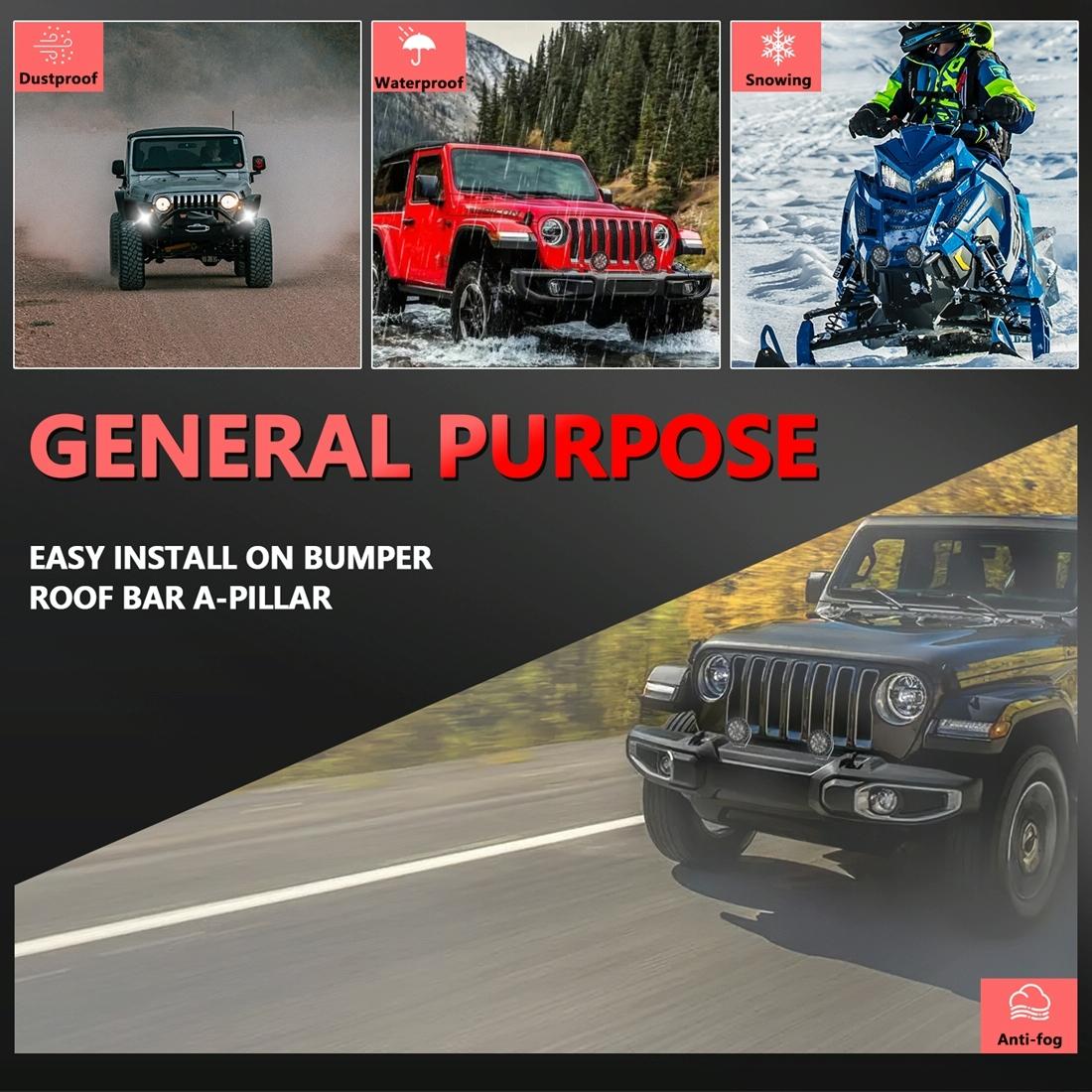 This off-road vehicle round work light features a high-brightness LED strip with multiple high-intensity chips and a laser chip, providing increased brightness and extended illumination distance. Its durable die-cast aluminum housing ensures reliable performance in harsh environments. The light offers excellent heat dissipation and waterproofing, making it suitable for various outdoor applications such as garden lighting, backyard illumination, backup lights, off-road lighting, and architectural lighting. Adjustable mounting accessories allow for easy beam direction adjustment after installation.