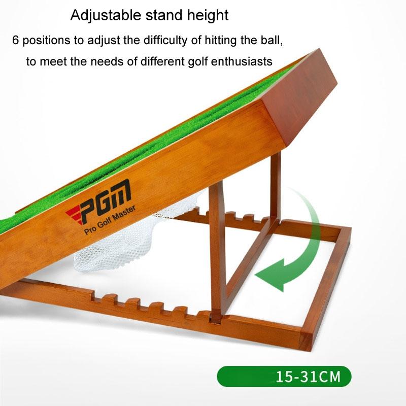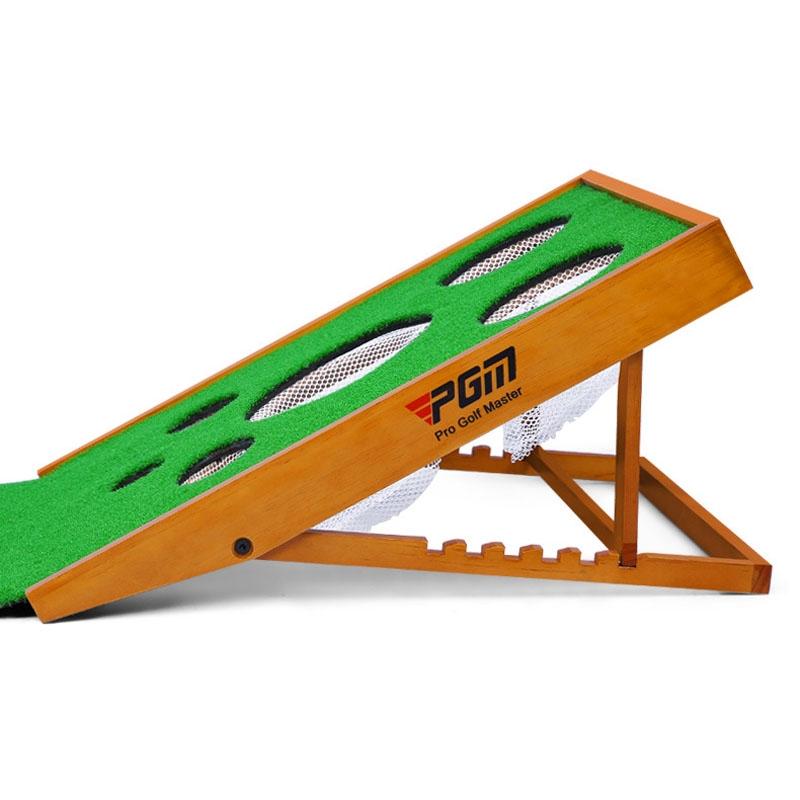 This portable golf practice net is designed for chipping and putting training, featuring a solid wood frame with a slope design and multiple target holes. Its foldable turf surface and lightweight construction make it easy to transport and store, suitable for improving golf skills at home or on the go.