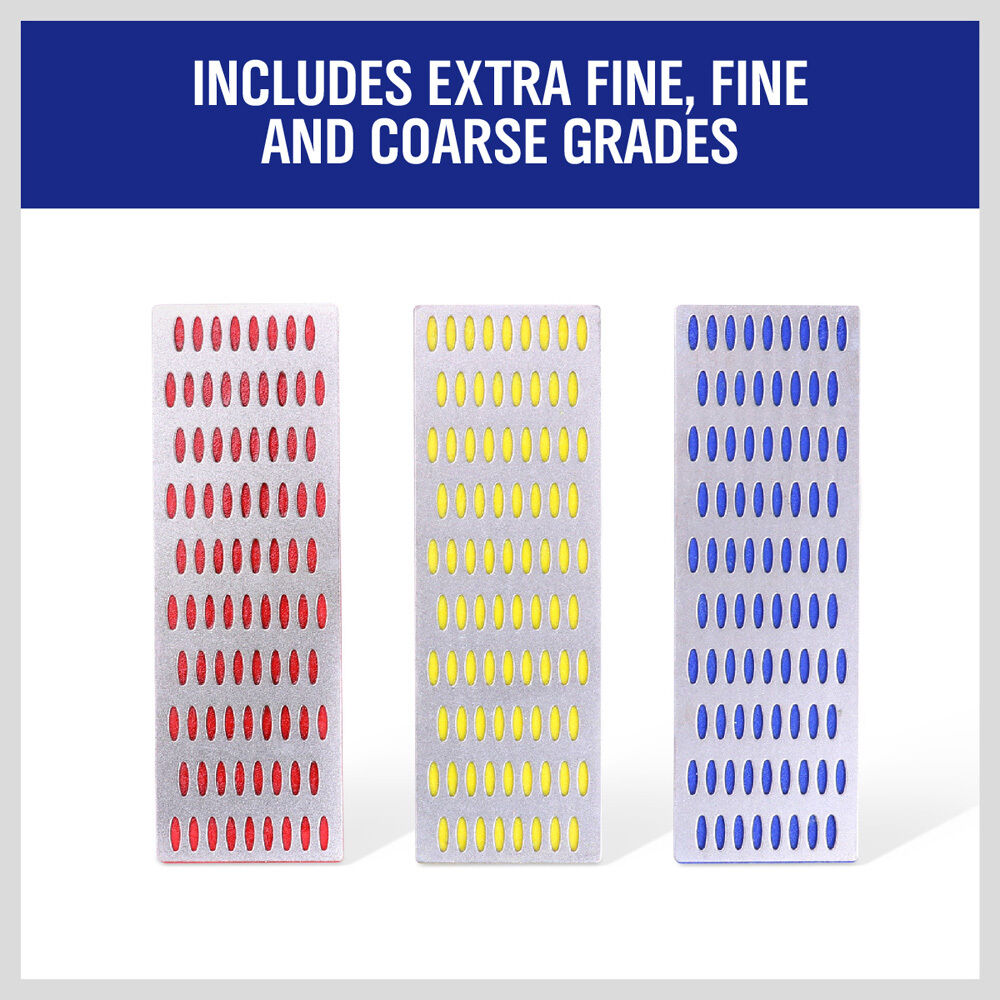 • This set features three grits: 200, 300, and 400, providing options for coarse to fine sharpening.