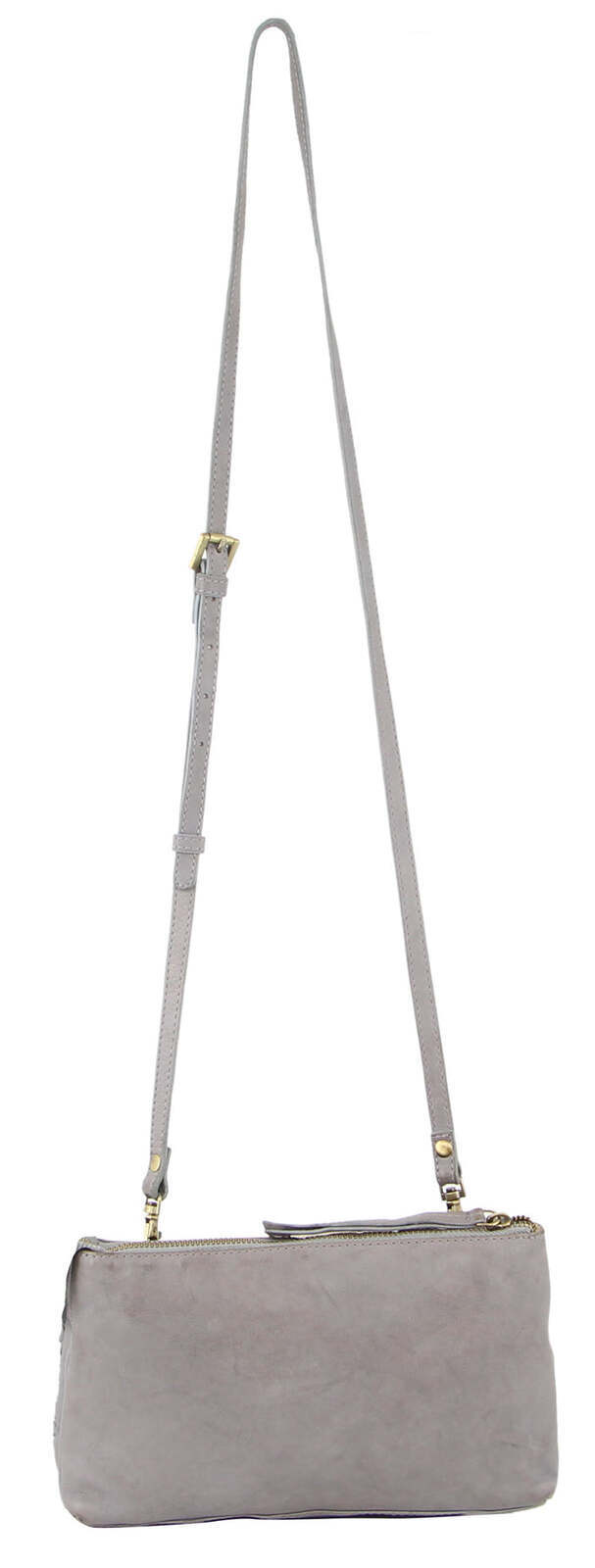- The cross-body/clutch bag has a secure zip closure, a detachable and adjustable shoulder strap, multiple internal and external zip compartments, and can be converted into a clutch.