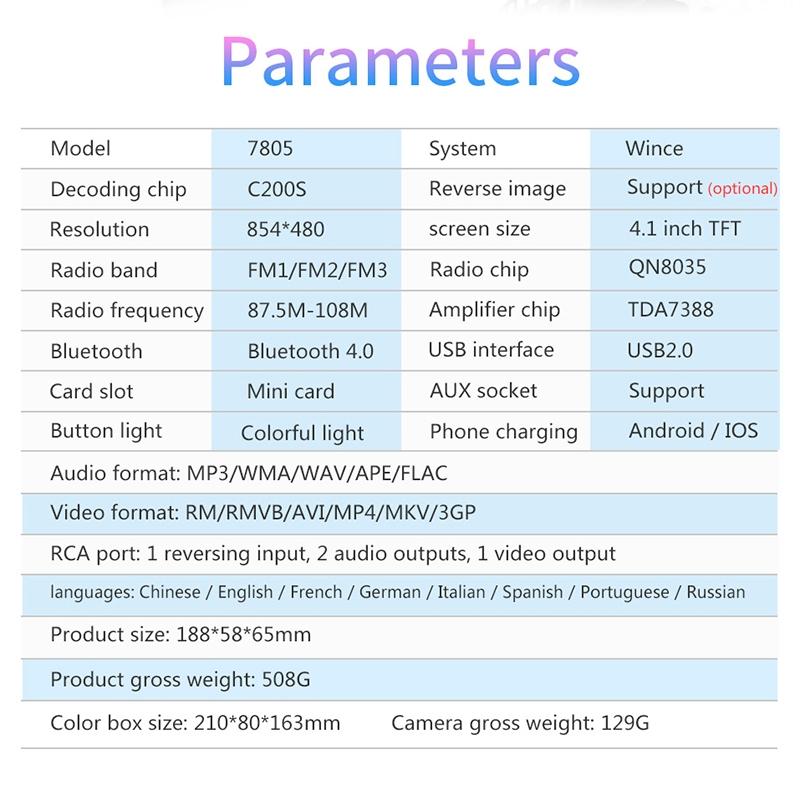 This 4.1 Inch Car MP5 Player offers a range of multimedia and connectivity features designed to enhance your driving experience. It supports various audio, video, and image formats, includes Bluetooth connectivity, and provides options for radio, USB, auxiliary input, and rear view camera compatibility. The device also features a remote control for convenient operation and supports mobile phone charging.