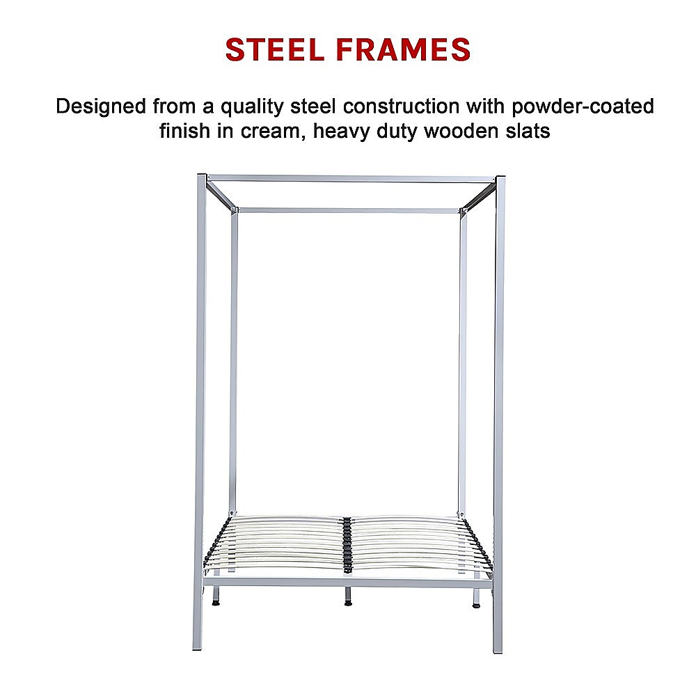 This four poster double bed frame combines classic elegance with modern durability. Its versatile design allows it to complement various bedroom styles, from traditional to contemporary, while providing a spacious and comfortable sleeping area.