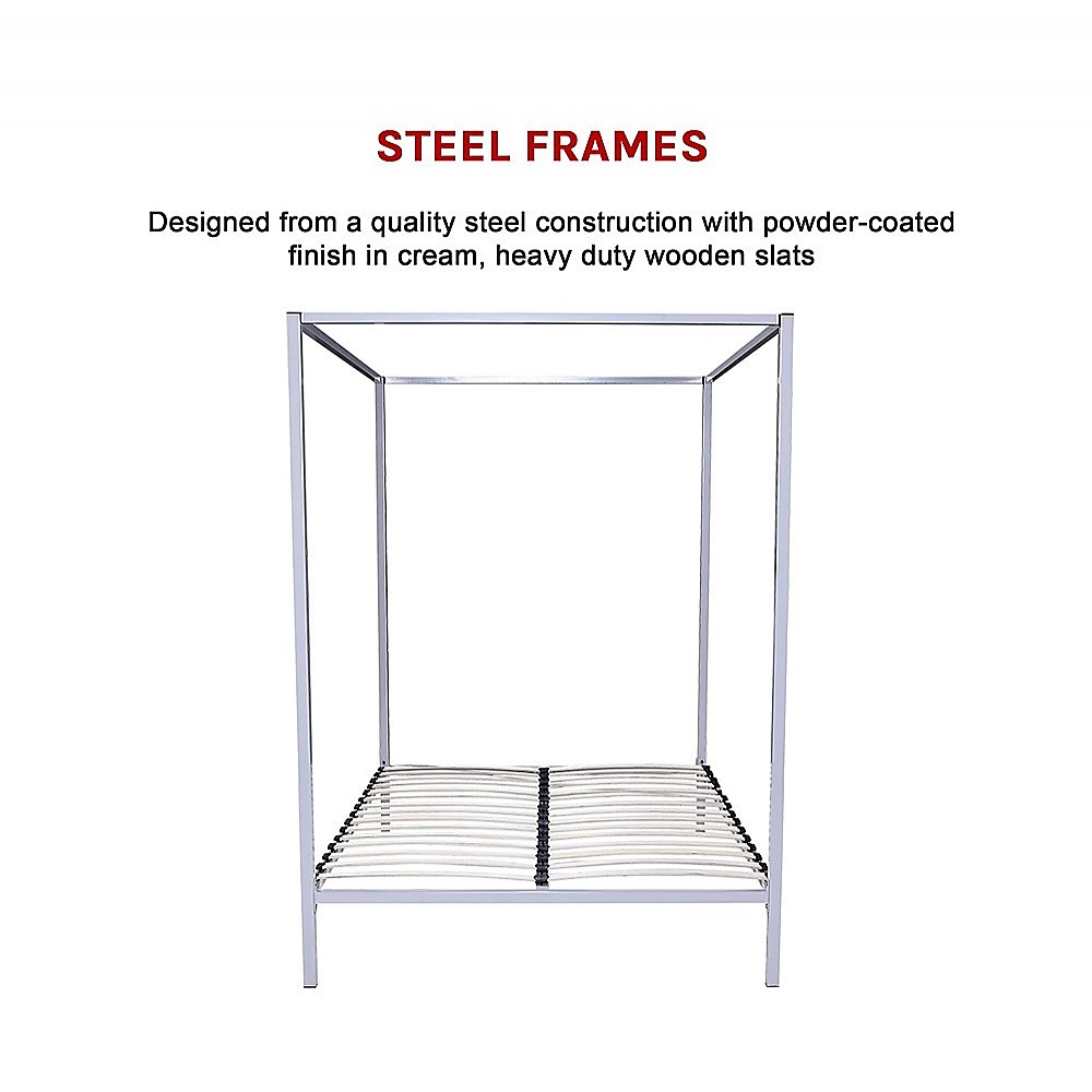 This four poster queen bed frame combines classic elegance with modern durability. Its simple yet stylish design makes it suitable for various bedroom styles, offering both aesthetic appeal and functional support. The neutral color and versatile design allow for easy customization with drapes or other decorative elements, fitting seamlessly into different decor schemes.