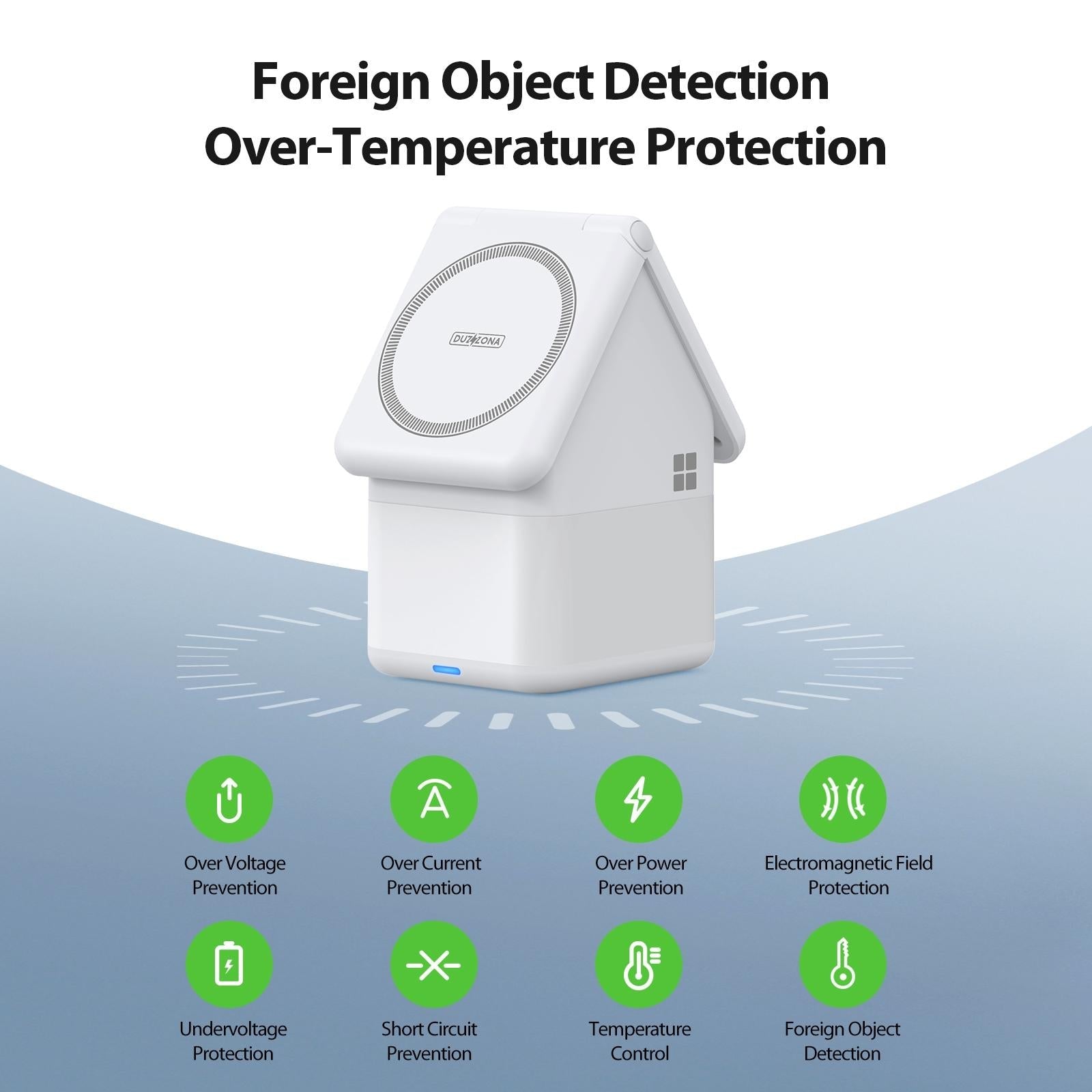 This 4-in-1 magnetic wireless charger combines functionality and stylish design, offering a convenient charging solution for multiple devices. It features a cozy house-inspired aesthetic with charming colors, making it a decorative addition to any space. The device provides ambient lighting, serving as a night light with various color options. It supports simultaneous charging of phones, AirPods, and smartwatches with fast charging capabilities, including a 15W magnetic wireless charge and quick battery replenishment. The charger also functions as a phone stand, enabling hands-free calls and multitasking, and can be used horizontally as a desktop clock and calendar.