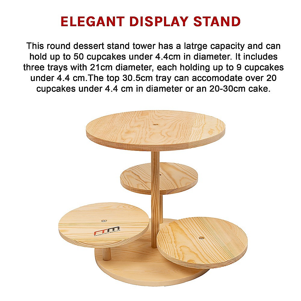 Dimensions include three trays with a diameter of 21cm each, capable of holding up to 9 cupcakes under 4.4cm in diameter. The top tray measures 30.5cm in diameter and can accommodate over 20 cupcakes under 4.4cm or a cake between 20-30cm in size. The stand has a total height suitable for displaying a variety of desserts with a large capacity for cupcakes and small cakes.