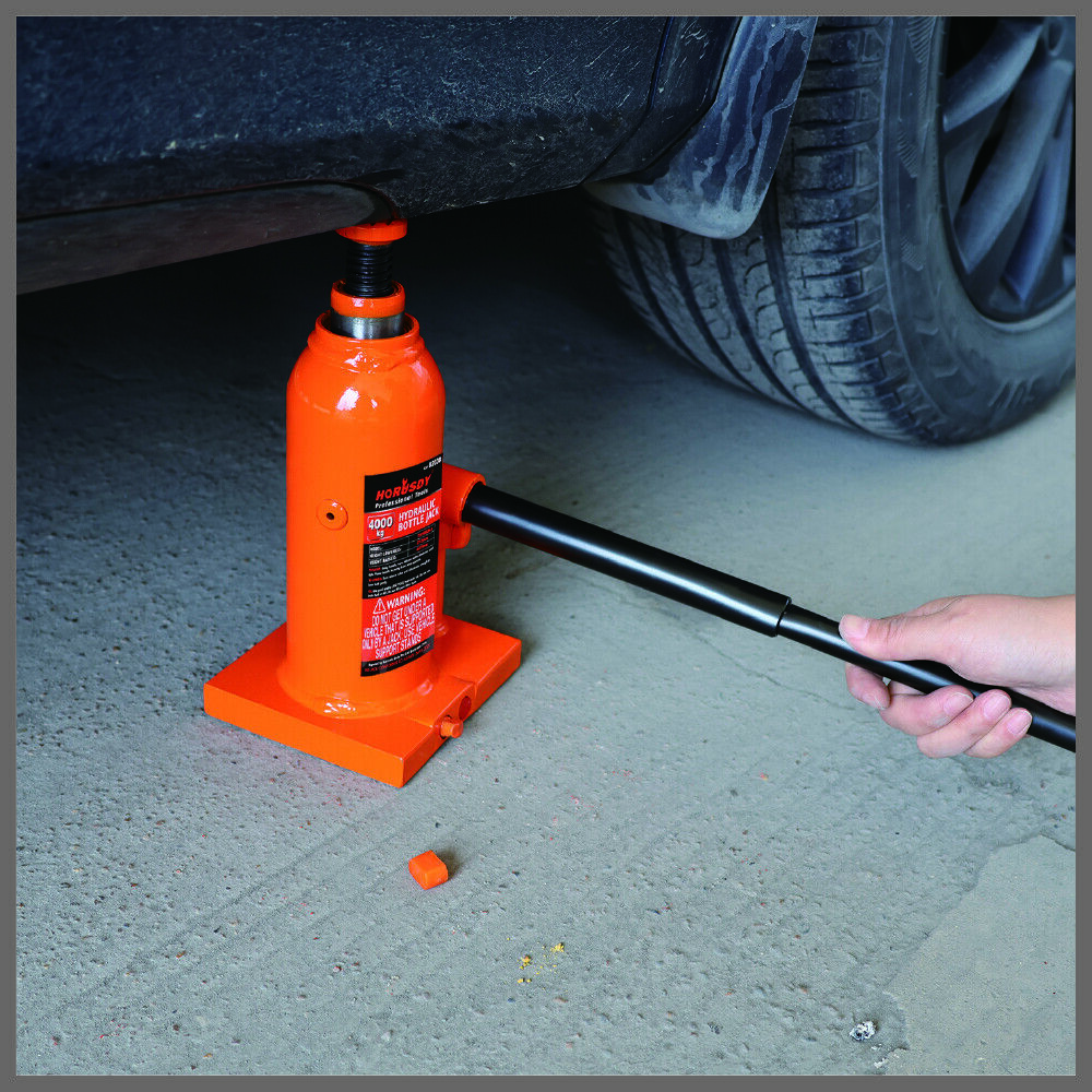 This heavy-duty hydraulic bottle jack is designed to lift vehicles with a maximum capacity of 4 tons. It features a robust construction and safety mechanisms to ensure secure and reliable operation during lifting tasks. The jack is suitable for various automotive and industrial applications, providing a safe and efficient lifting solution.