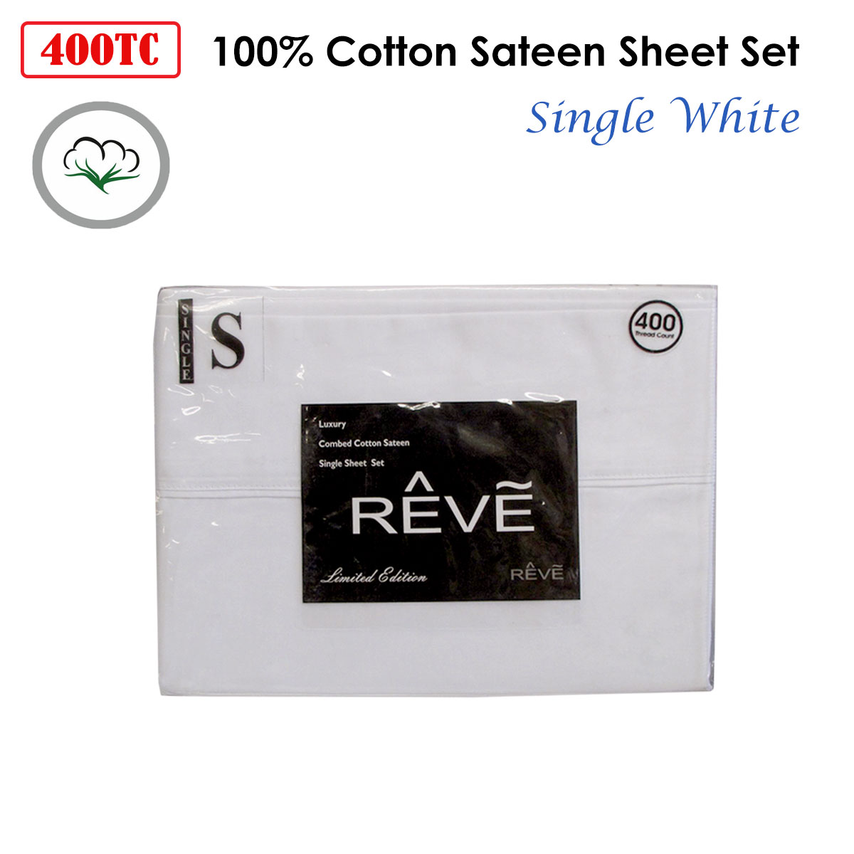 400TC Reve 100% Cotton Sateen Sheet Set White Single