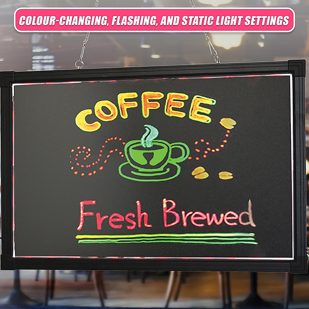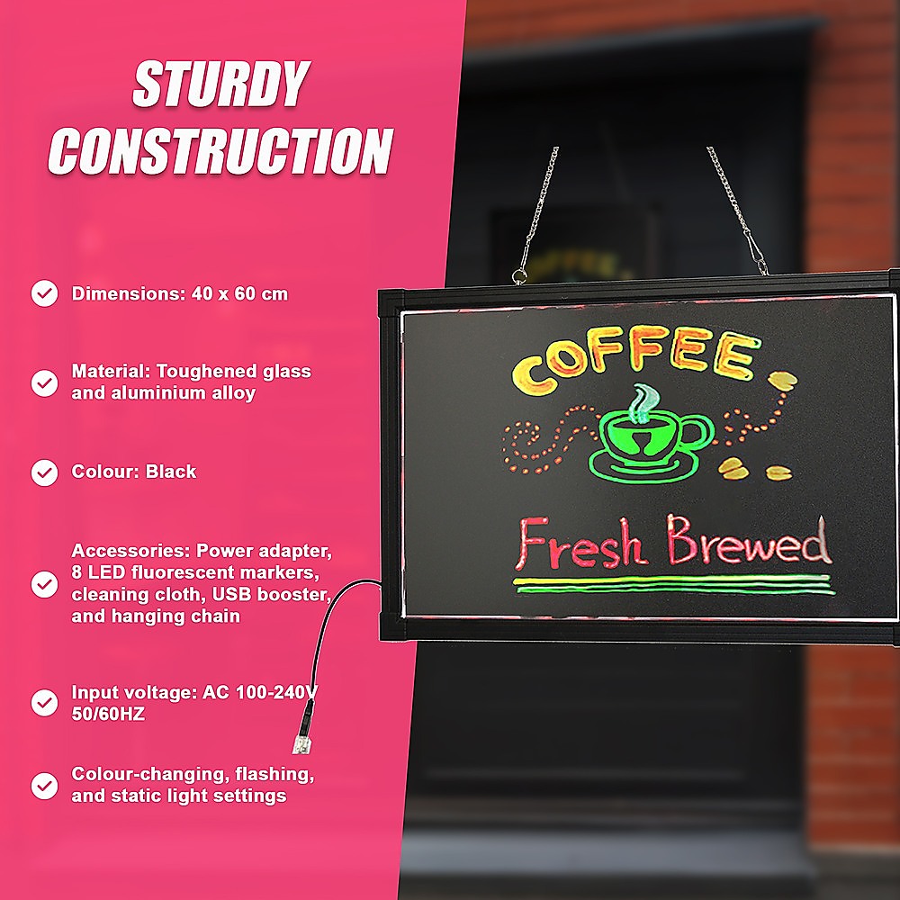 This LED drawing and writing board measures 40 by 60 centimeters and features a durable construction with toughened glass and aluminium alloy. It offers multiple lighting modes including colour-changing, static, and flashing options, making it suitable for various creative and promotional uses. The board is designed to inspire creativity and sensory development for children and adults alike, including those with learning differences.