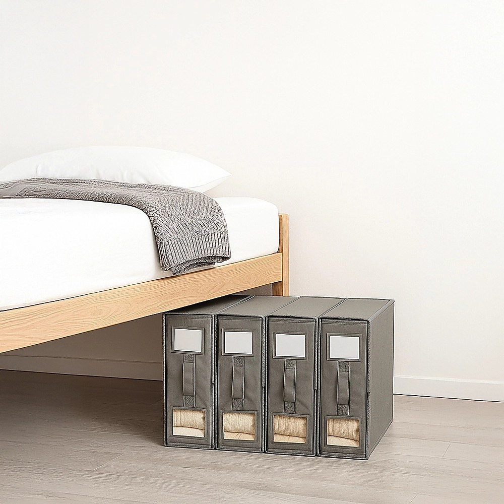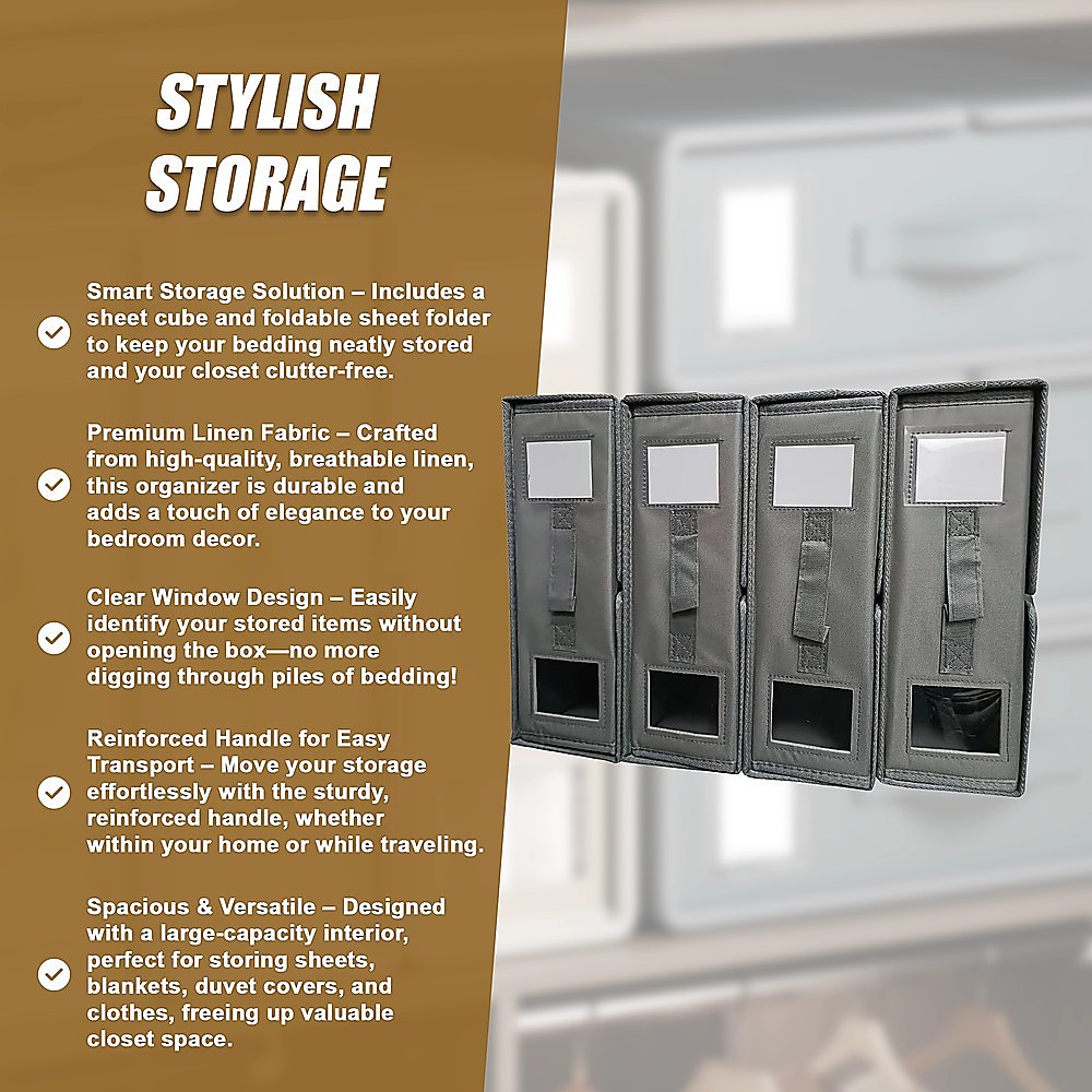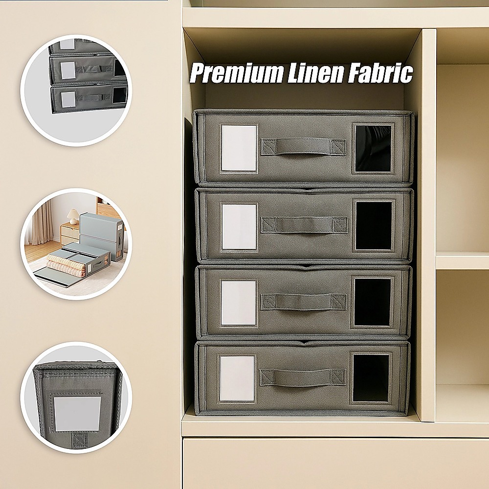 This set includes four foldable fabric storage bins designed to help organize your bedding and clothing. Made from high-quality linen fabric, these bins combine durability with a stylish appearance. They feature clear windows for easy identification of contents and reinforced handles for convenient transport, making them a practical addition to any closet or storage space.