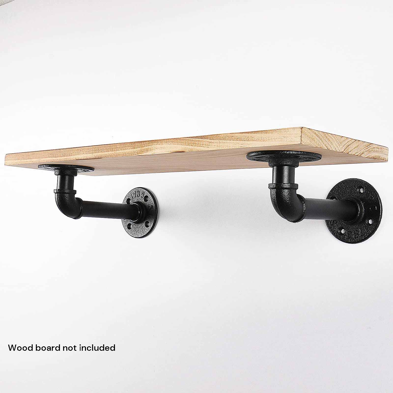 This set includes four pipe floating shelf brackets designed for mounting wooden boards with a depth ranging from 18cm to 34cm. Made from high-quality iron with a waterproof black coating, these brackets combine durability with a stylish industrial aesthetic. They are suitable for creating rustic or vintage decor in various spaces such as kitchens, garages, or corners.