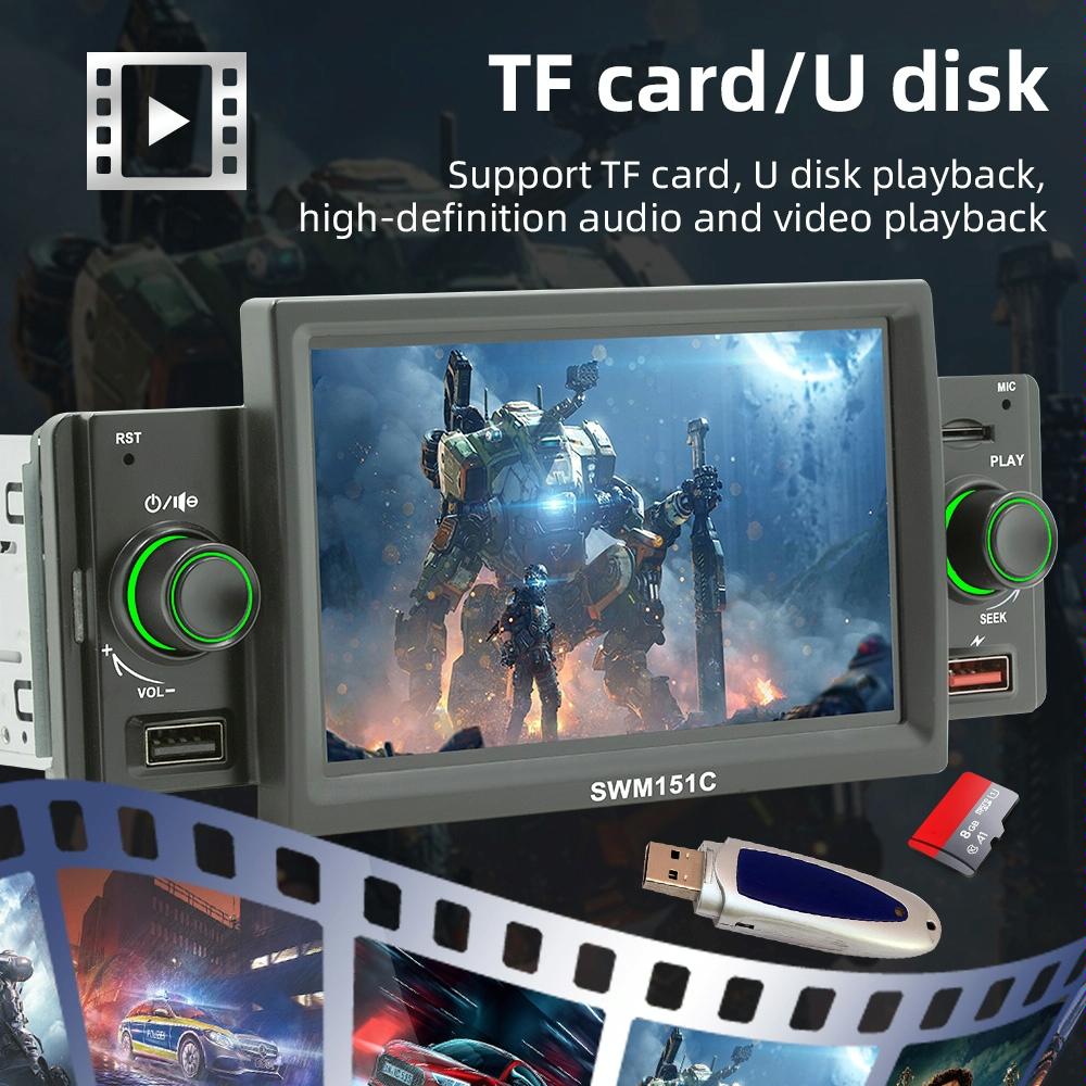 This 5-inch car multimedia player features seamless integration with CarPlay and Android Auto, providing a convenient and modern entertainment experience. It offers multiple functions including radio, Bluetooth connectivity, rear view camera support, and steering wheel control learning. The device is designed to enhance your driving experience with colorful lighting and easy connectivity options.