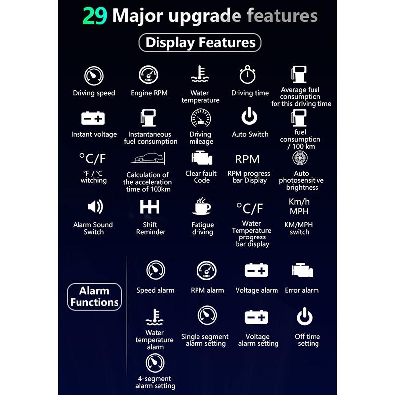 - Displays driving speed, water temperature, battery voltage, engine speed, fuel consumption, trip data, travel time, and fault codes